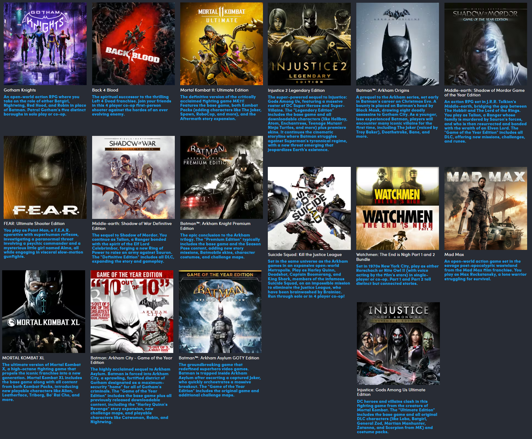 - Injustice 2 Legendary Edition - contém o título básico e conteúdo adicional. O valor é de US$ 59,99 quando não está em promoção (não há dados disponíveis sobre o preço mais baixo de todos os tempos), e o jogo padrão é Steam Deck Playable.