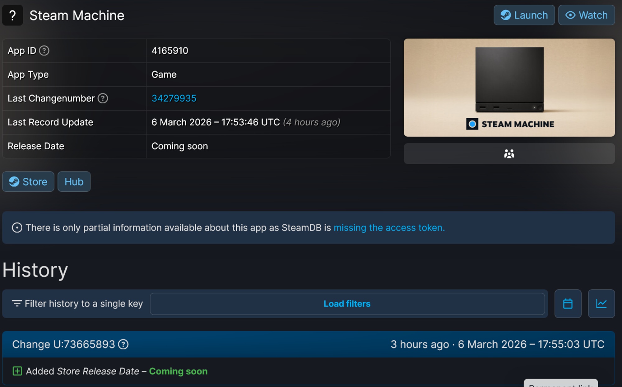 O SteamDB monitora IDs de aplicativos e pacotes, bem como outros dados relacionados ao Mercado da Valve. Em 5 de março, ele detectou ativos modificados antes de mudanças mais significativas no dia seguinte. A data de lançamento na loja para todos os novos hardwares agora está listada como "em breve". Anteriormente, as páginas não tinham visto revisões desde 18 de novembro de 2025.
