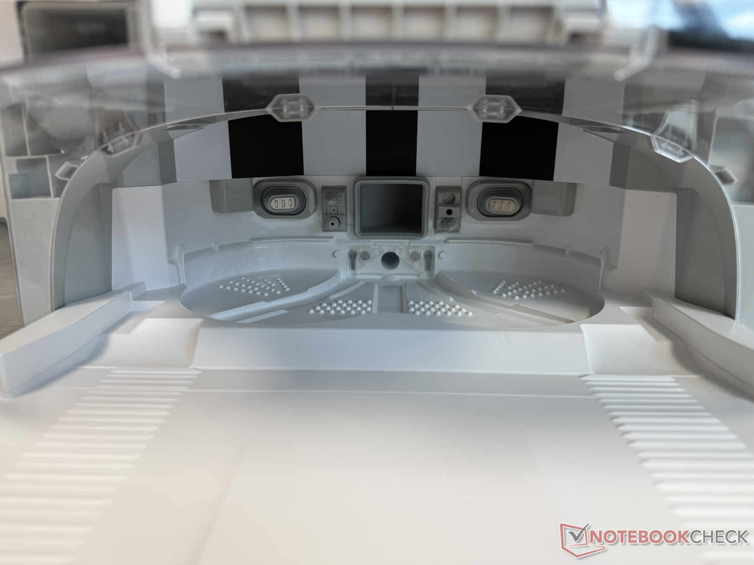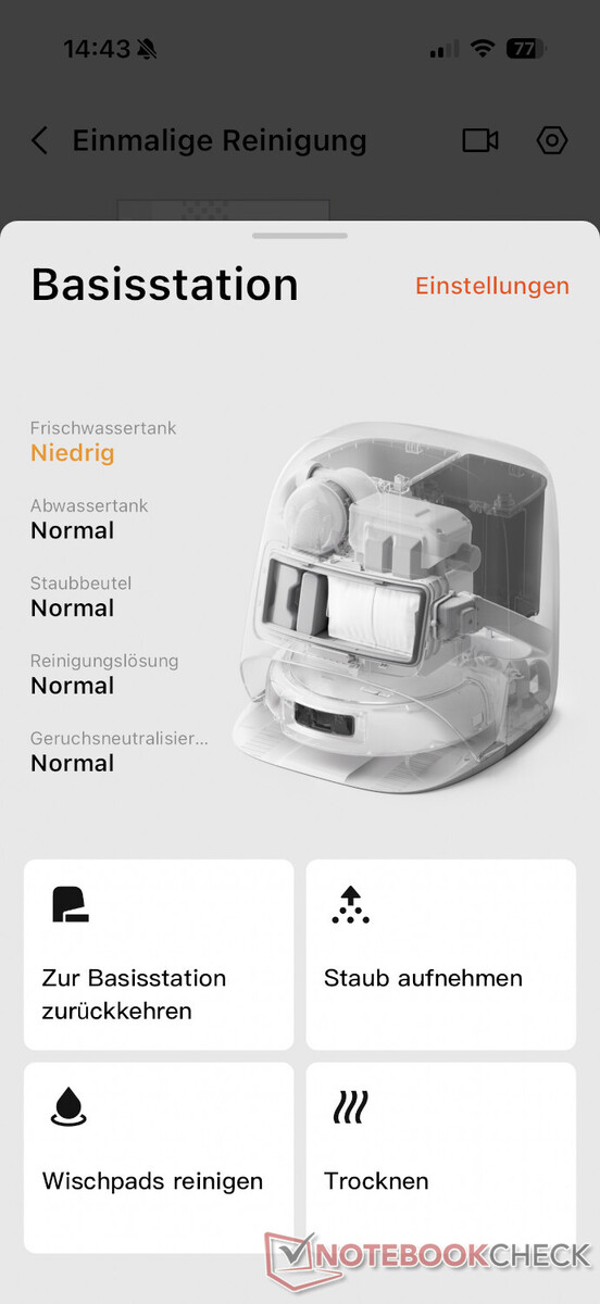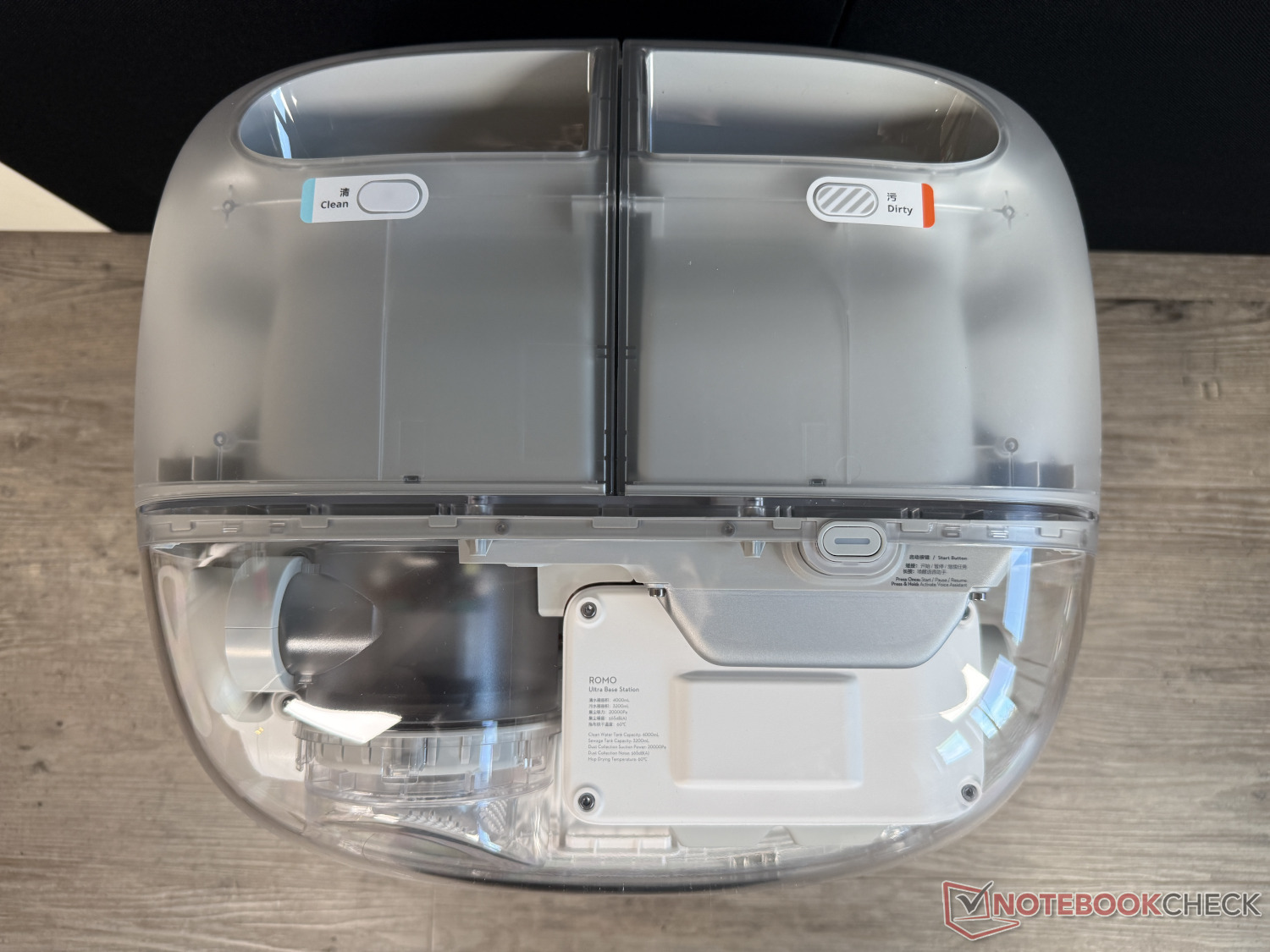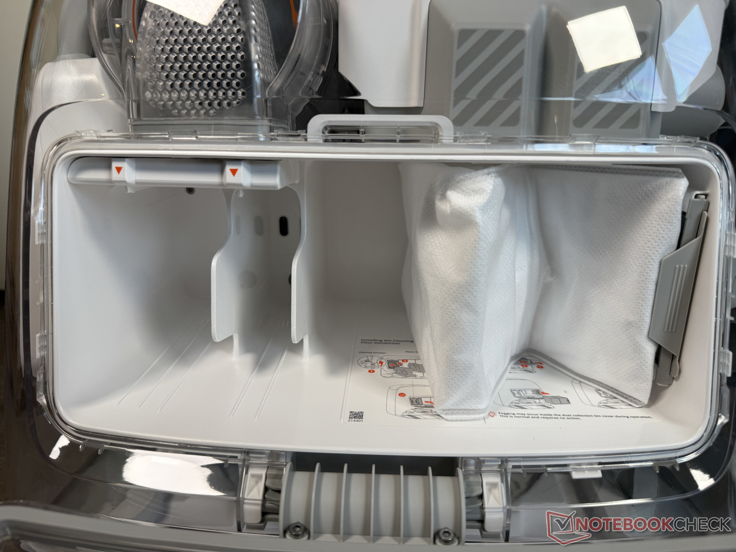 A estação base autolimpante também está incluída. De acordo com o fabricante, ela promete até 200 dias de operação sem manutenção. No entanto, isso se aplica apenas à extração de pó no saco de pó de 2,4 l. O tanque de água doce de 4 l e o tanque de água residual de 3,2 l requerem atenção mais regular. Depois de lavar os esfregões com água quente até 60°C, que são secos com ar quente, a tábua de lavar da estação se limpa sozinha. Isso funcionou bem no teste.
