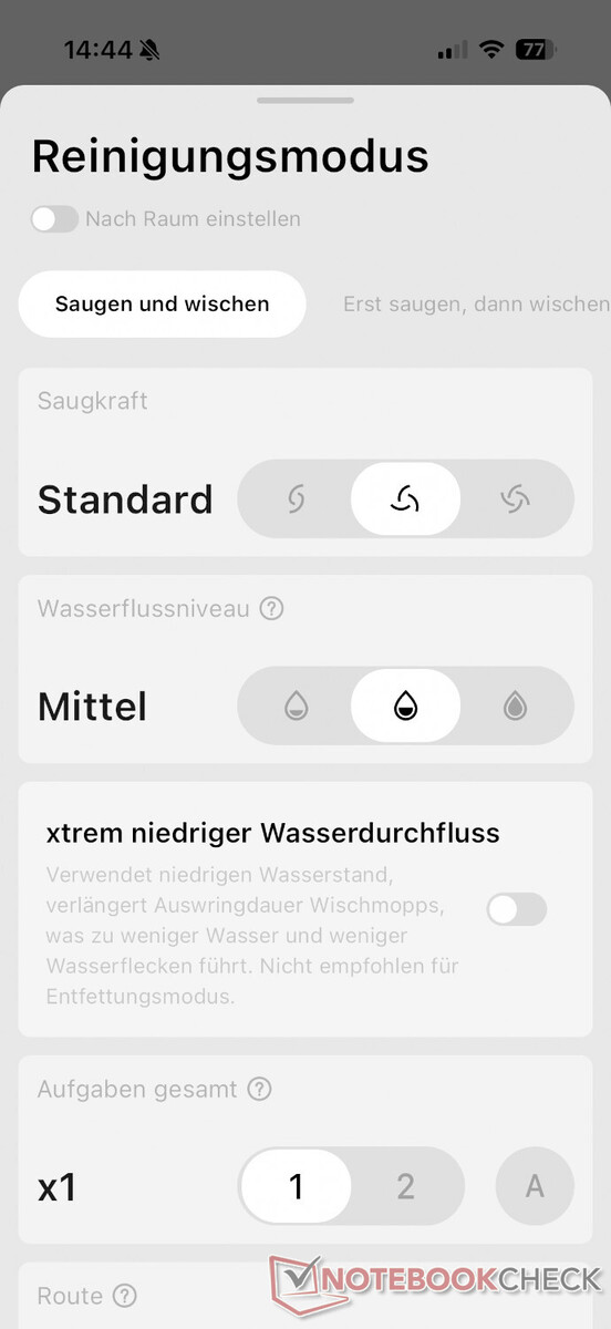 O desempenho do esfregão também é bom para um aspirador robô com dois esfregões giratórios, mas não no mesmo nível dos modelos com rolo esfregão, como o Dreame Aqua10 Ultra Roller Complete. No entanto, temos que observar que o piso estava definitivamente mais úmido em um nível de umidade médio do que com outros aspiradores robôs com função de esfregar em um nível comparável. Com uma atualização de firmware para o lançamento global na semana passada, a DJI introduziu outra opção com um fluxo de água particularmente baixo, de modo que agora há um total de quatro níveis para escolher.