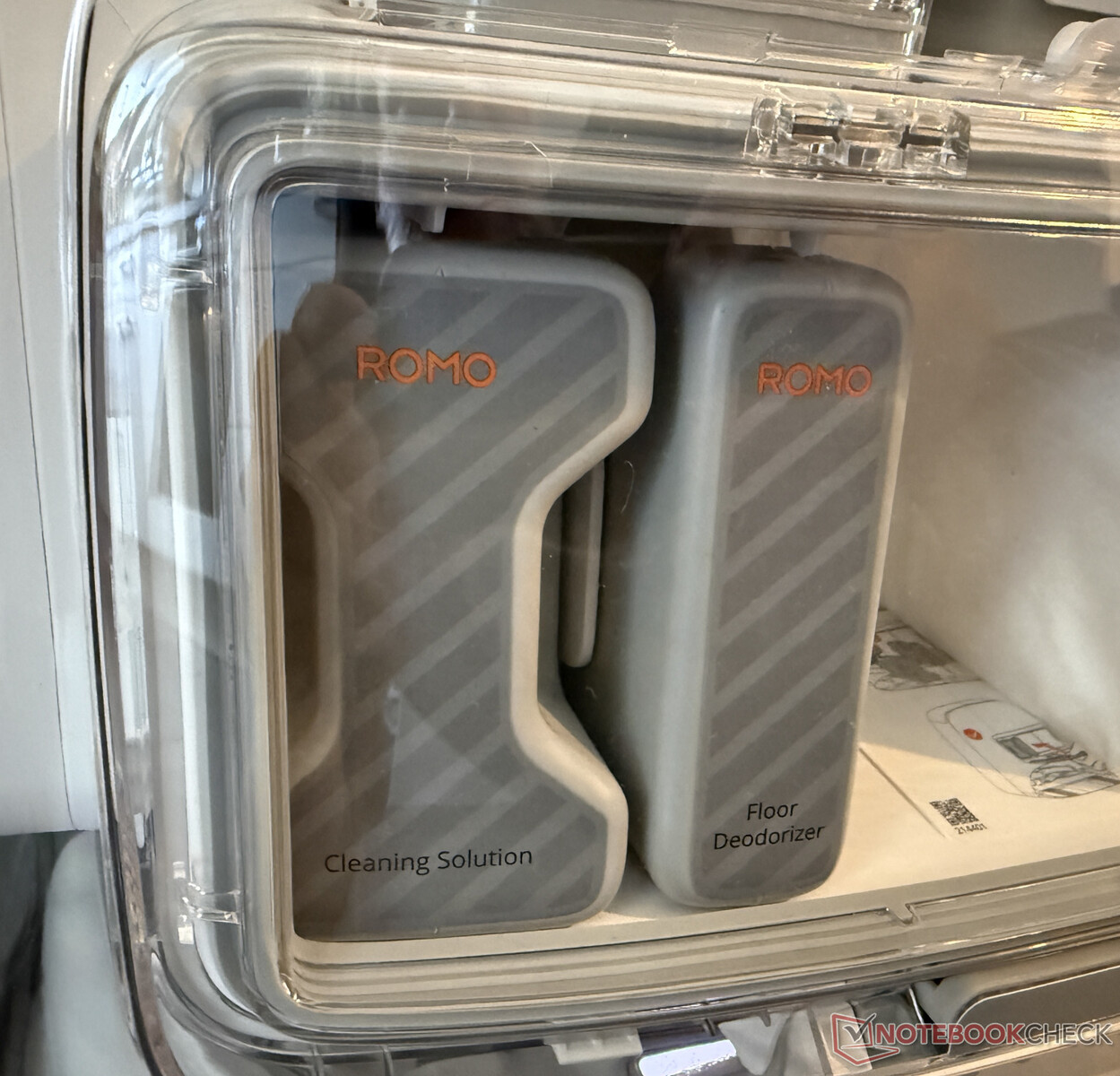 Em uma observação positiva, a versão principal do DJI Romo tem a opção de adicionar dois agentes de limpeza diferentes (em vez de um no Romo S e no Romo A), o que pode melhorar o resultado da limpeza e expandir as possibilidades. O escopo de fornecimento inclui uma solução de limpeza e um removedor de odores exclusivo para pisos. No entanto, eles são conectados diretamente à estação com seu recipiente. Portanto, não é possível reabastecer um tanque com seus próprios recursos. Em vez disso, o senhor precisa contar com os acessórios caros do fabricante, que custam 15,99 euros por solução.