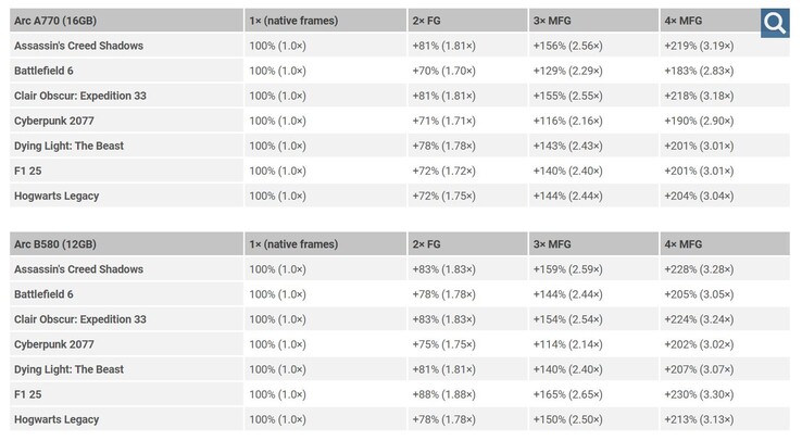 Na prática, testes independentes também confirmam ganhos maciços de taxa de quadros. Por exemplo, nossa cobertura anterior afirma que a ativação da geração de quadros 4× no Arc B580 ou A770 da Intel praticamente dobrou ou mais que dobrou o FPS em jogos como Battlefield 6. Da mesma forma, Benchmarks internos da AMD da AMD mostram que a geração de quadros do FSR 3.1 aumenta o FPS em cerca de 2,5 a 3,6 vezes em títulos reais (por exemplo, 3,6 vezes em Ratchet & Clank). A geração de quadros agora é bastante comum em jogos de PC de ponta e funciona até mesmo em GPUs mais antigas por meio de DLSS/FSR e da futura Xe Frame Gen da Intel.