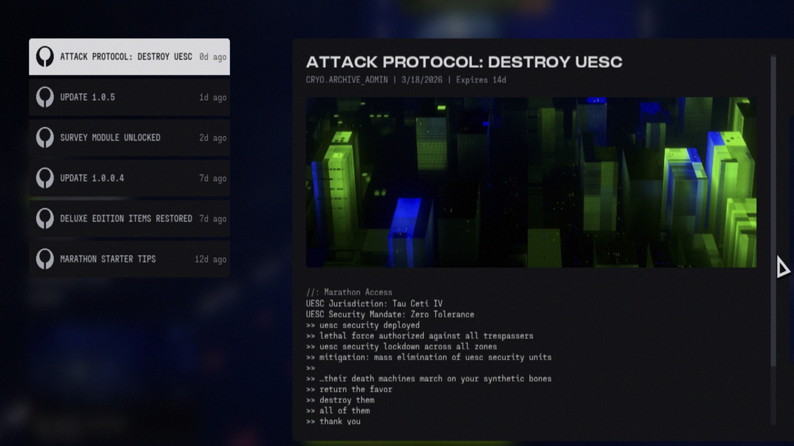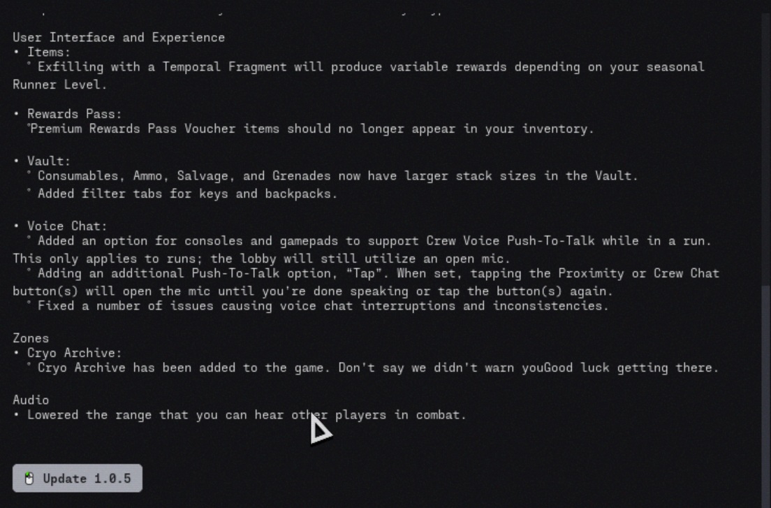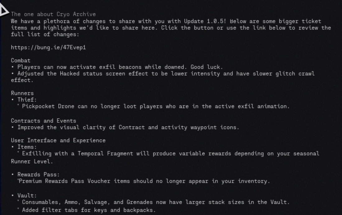 A atualização 1.0.5 de Marathon adiciona a nova zona Cryo Archive, permite que os jogadores ativem os sinalizadores exfil enquanto estão abatidos e lança uma longa lista de mudanças em combate, contratos, interface do usuário, bate-papo por voz, estabilidade, armas, mods e áudio. A Bungie também vinculou várias novas adições de loot diretamente ao Cryo Archive, incluindo vantagens de implante e mods que só podem ser encontrados lá.