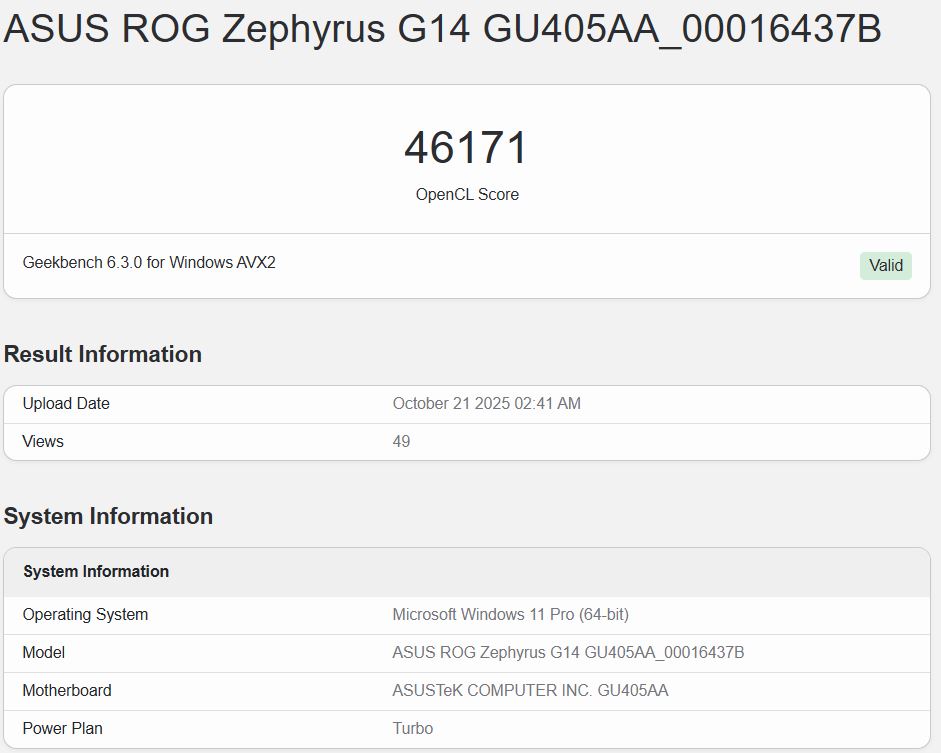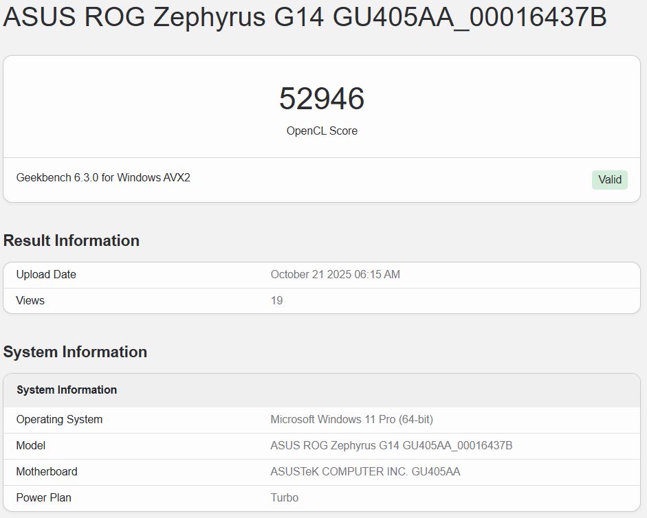 Na extremidade mais alta, a iGPU do Core Ultra X7 358H dentro do ROG Zephyrus G14 obteve 52.946 pontos no benchmark Geekbench 6.5 OpenCL. Na extremidade mais baixa, a pontuação foi de 46.171. Há também outras listagens com pontuações que ficam entre esses dois números.