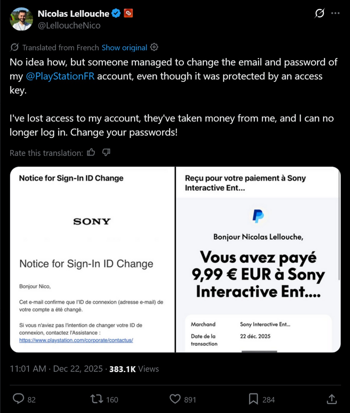 O redator da Numerama, Nicolas Lellouchedocumentou suas dificuldades nas mídias sociais. Ele primeiro detalhou como um hacker comprometeu sua Conta da PSN e substituiu o e-mail e a senha associados. Lellouche também notou uma cobrança de 9,99 euros, que é a taxa para as alterações.