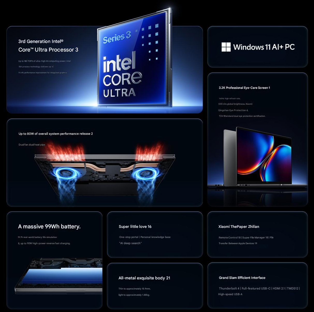 Há três configurações principais disponíveis para os dois, e a opção básica apresenta o Intel Core Ultra 5 325, um processador de médio porte da linha. Ele é combinado com 24 GB de RAM e 1 TB de armazenamento. A segunda configuração aumenta para o Core Ultra 5 338H, uma opção mais capaz com a iGPU Arc B370. A Xiaomi combinou essa opção com 32 GB de RAM e 1 TB de armazenamento.