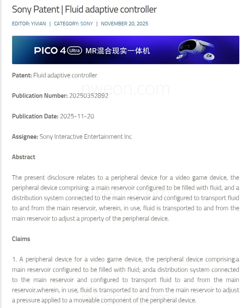 A patente da Sony também propõe aquecer ou resfriar o líquido para obter um feedback ainda mais realista. Os críticos já estão zombando da ideia, preocupados com o vazamento de acessórios. Pode levar muitos anos ou nunca antes que a Sony implemente o conceito radical. Mesmo assim, o registro argumenta que a ideia teria outras vantagens. A descrição observa que "sistemas magnéticos ou mecânicos" adicionam peso aos controles.