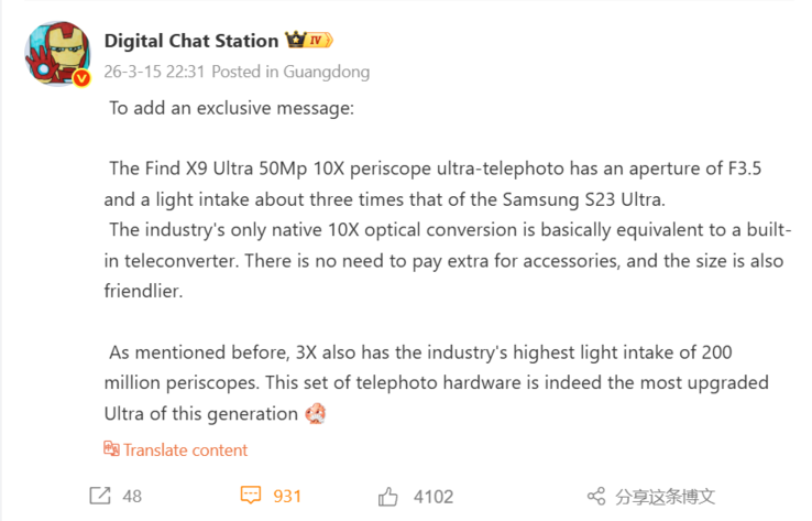 O conhecido vazador Digital Chat Station recentemente compartilhou novos detalhes sobre o hardware da câmera do Find X9 Ultra. Embora sua lente teleobjetiva periscópica de 10x provavelmente não vença nenhuma competição de sensores com um ISOCELL JN5 de 1/2,76 polegadas, há rumores de que a câmera apresenta uma abertura f/3,5 relativamente grande. Para fins de comparação, a lente teleobjetiva 10x anterior da Samsung - vista pela última vez no Galaxy S23 Ultra - usa um sensor significativamente menor, de 1/3,52 polegadas, e uma abertura muito mais estreita de f/4,9. Para ser exato, a nova câmera teleobjetiva da marca Hasselblad é 3,24 vezes mais rápida do que a lente teleobjetiva 10x anterior da Samsung (230 mm).