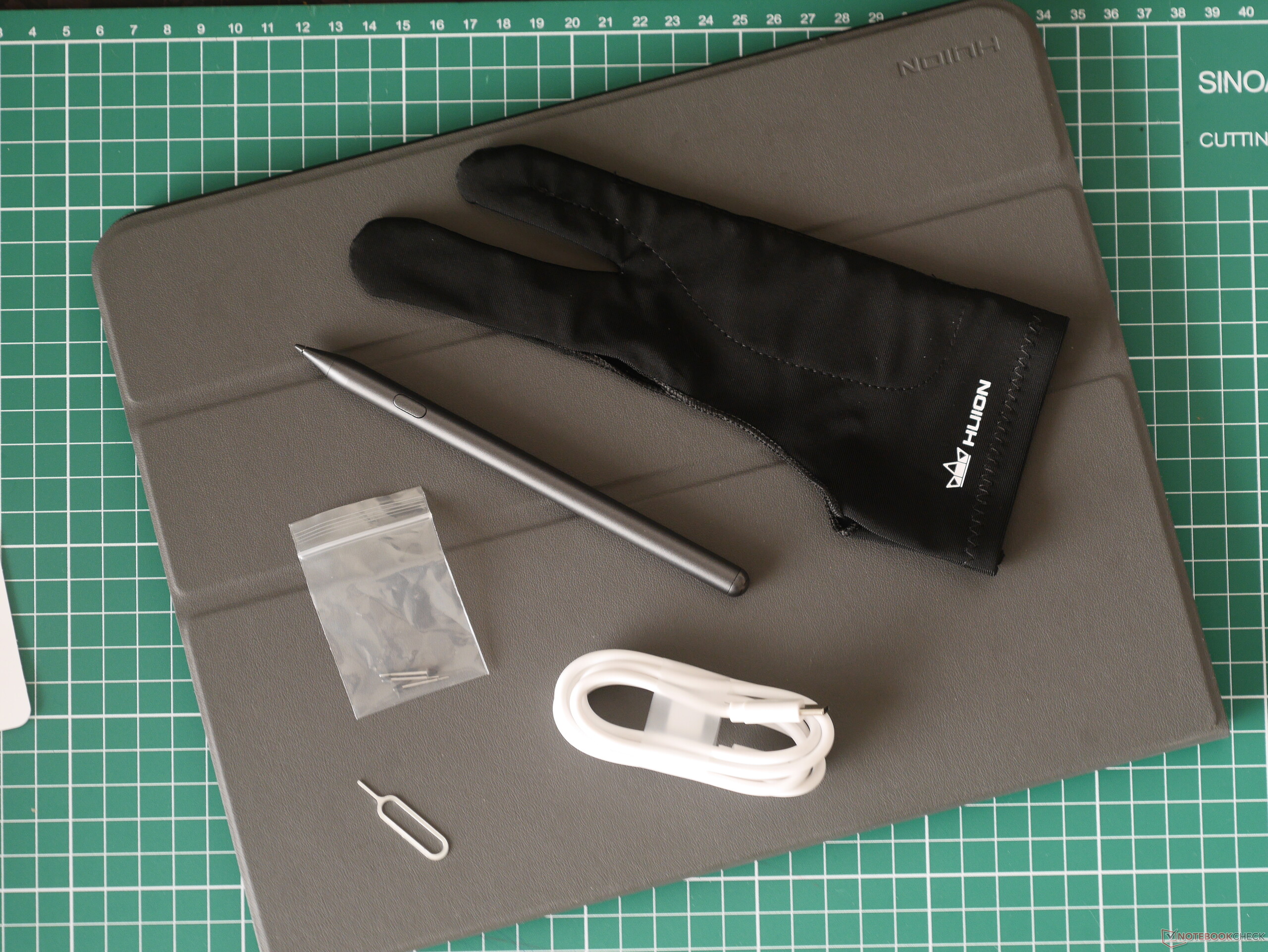 Exceto pela falta de um bloco de carregamento incluído, o kit de acessórios do Huion Kamvas Slate 13 é decente. A luva de desenho ambidestra é suficientemente elástica para se adaptar a uma variedade de tamanhos de mão e reduzir toques acidentais.