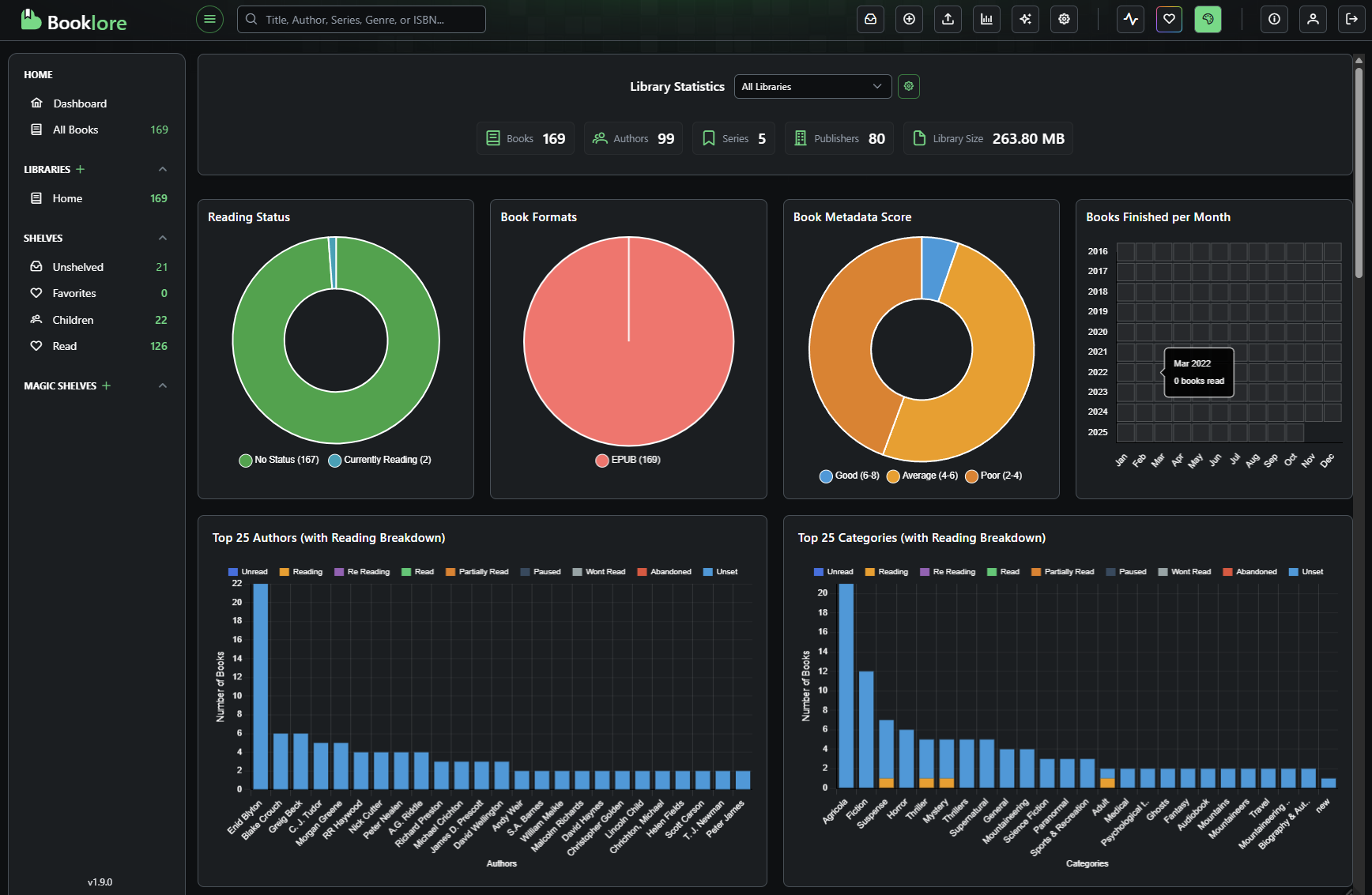 Booklore permite que o senhor hospede e gerencie sua própria biblioteca de e-books. Ele é compatível com todos os principais formatos de livros e faz o download automático de metadados para preencher a arte da capa e obter sinopses dos livros. Os livros podem ser categorizados de acordo com as prateleiras que o senhor mesmo cria, e diferentes usuários podem ser configurados com acesso a diferentes bibliotecas. O senhor pode importar um número ilimitado de livros na configuração inicial ou importar diretamente pela interface da Web.