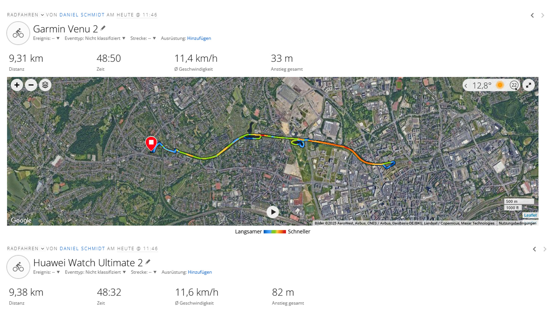 Para a frequência cardíaca, usamos uma cinta peitoral Polar H10 como referência. O desvio da frequência cardíaca em repouso é de uma batida por minuto, equivalente a 1,75%. Também medimos a frequência cardíaca de desempenho em três momentos diferentes. Nesses testes, o desvio médio é de 0,96%, sendo o maior desvio individual de duas batidas por minuto.