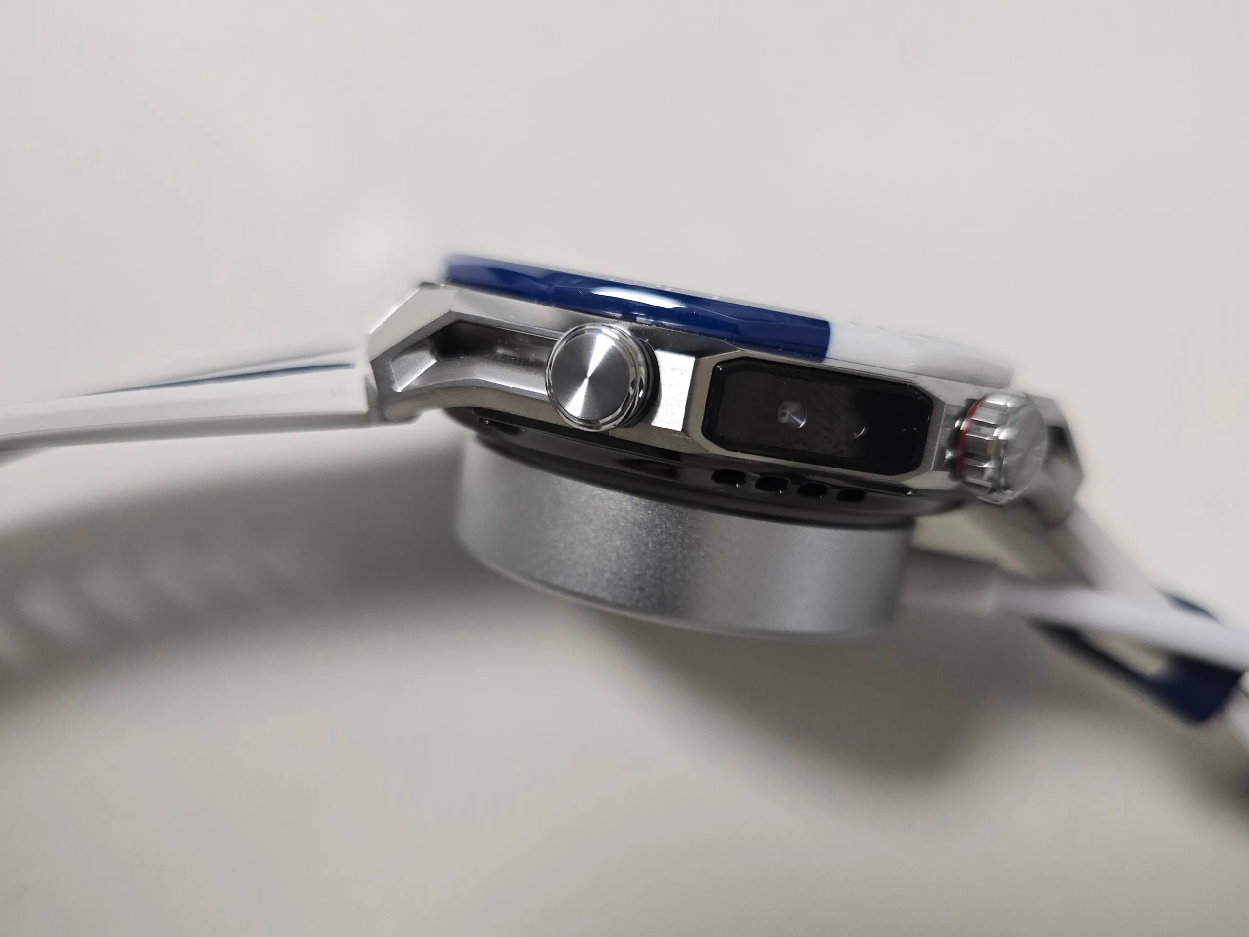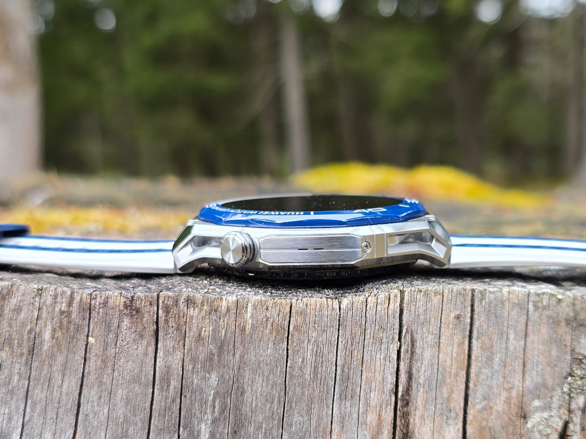 No lado direito, há uma coroa giratória e pressionável, um botão, um alto-falante e o sensor X-Tap da Huawei. O lado esquerdo abriga outro botão e um sensor de profundidade. A pulseira de 22 milímetros pode ser trocada sem ferramentas.