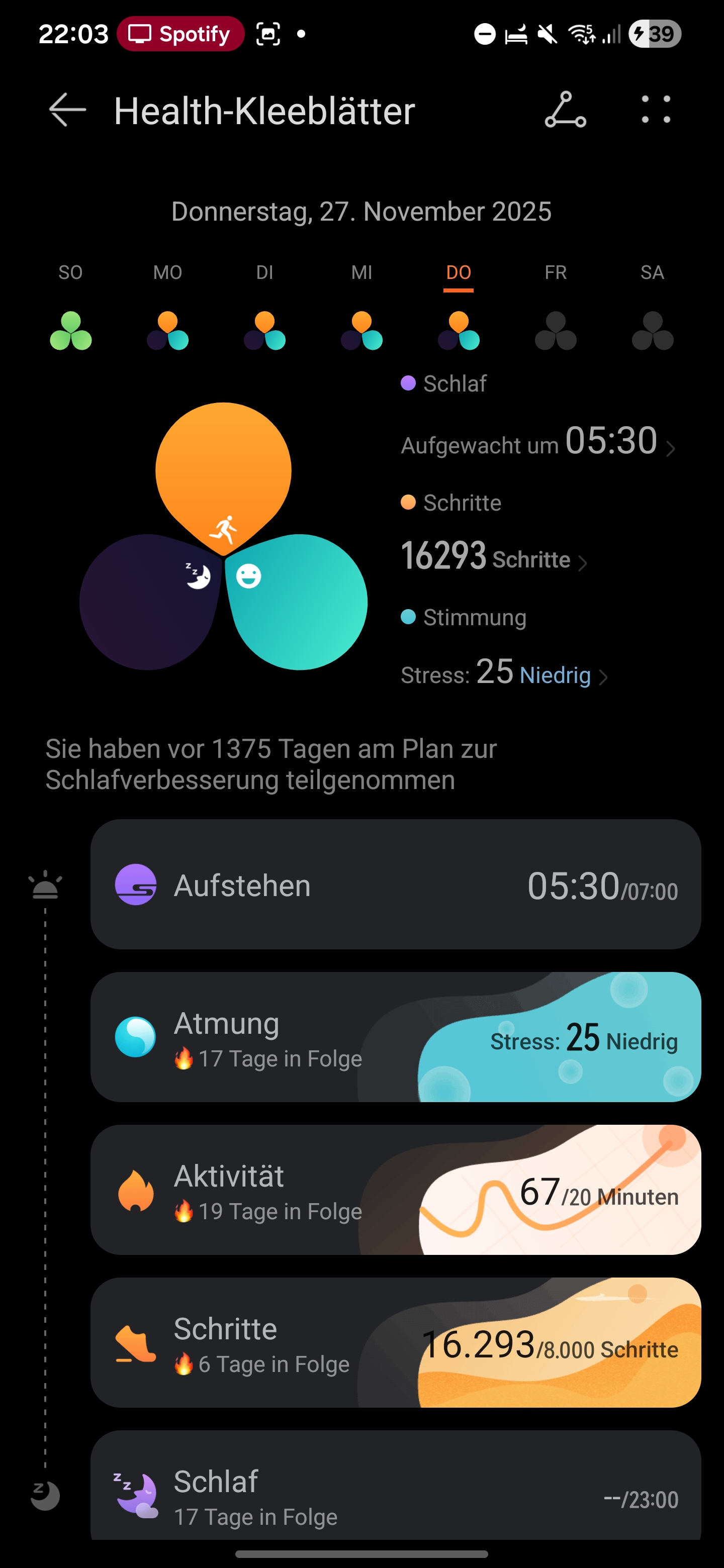 A Huawei oferece vários formatos visuais para metas de atividade. Além dos conhecidos anéis, há também um layout em forma de trevo. Suas folhas são preenchidas ao longo do dia, com o smartwatch monitorando os padrões diários e definindo metas, como acordar dentro de uma janela de tempo específica ou permanecer ativo durante todo o dia.