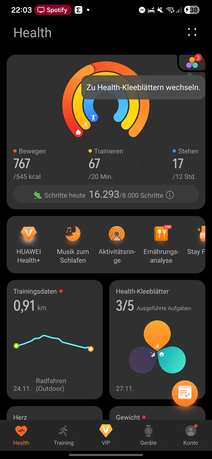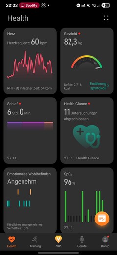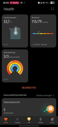 O aplicativo Health é dividido em cinco seções: Saúde, Treinamento, VIP, Dispositivos e Conta. A guia Saúde funciona como um painel de controle para todos os dados biométricos registrados, exibidos como blocos personalizáveis.