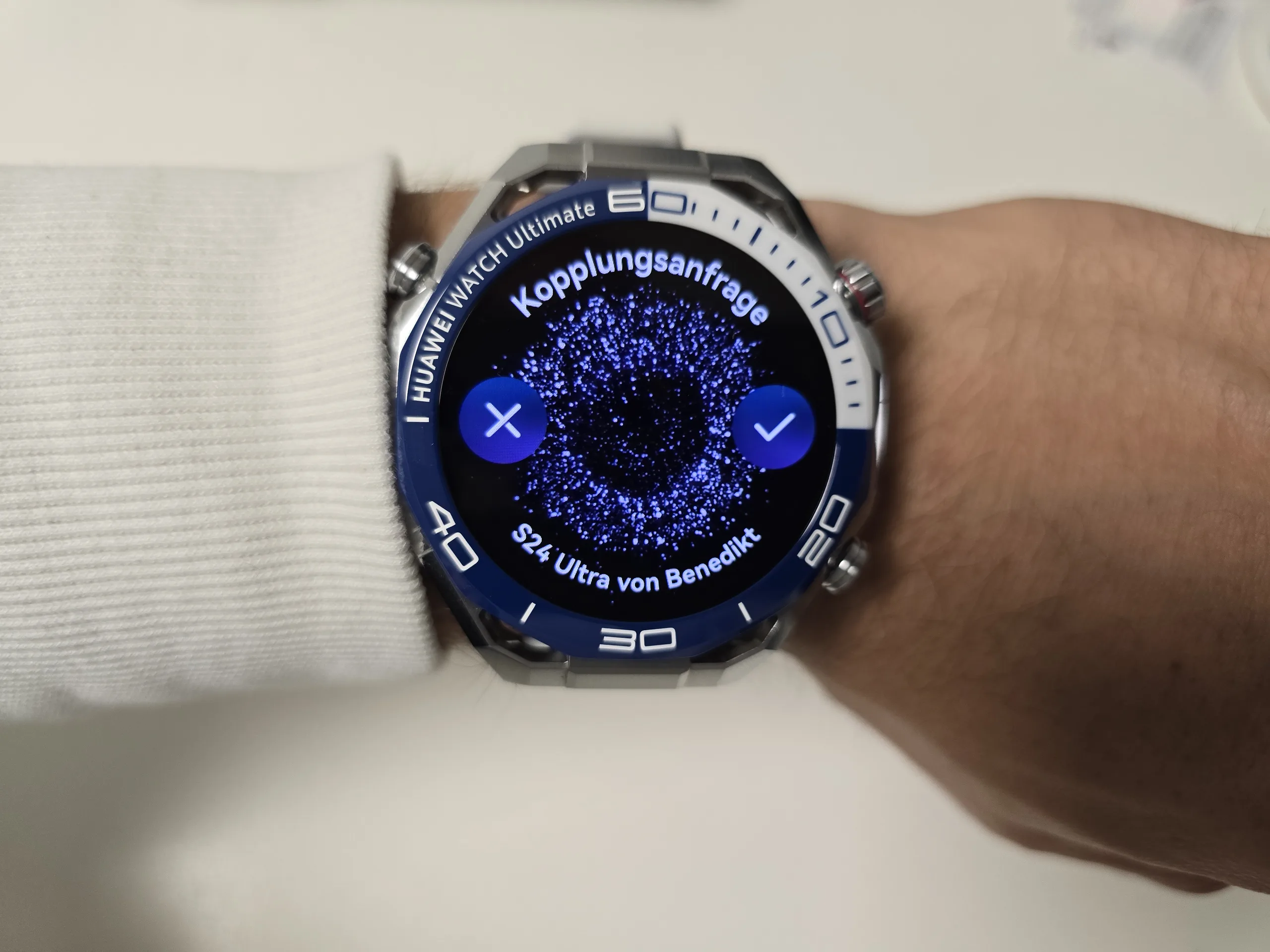 A Huawei oferece o Watch Ultimate 2 em duas variantes de cores. O modelo preto é mais discreto, enquanto a versão prata com detalhes em azul e branco é visivelmente mais atraente. Os dois modelos são idênticos em termos de hardware. A diferença de preço de 100 euros vem da pulseira de elos de titânio adicional incluída na versão prata/azul.