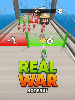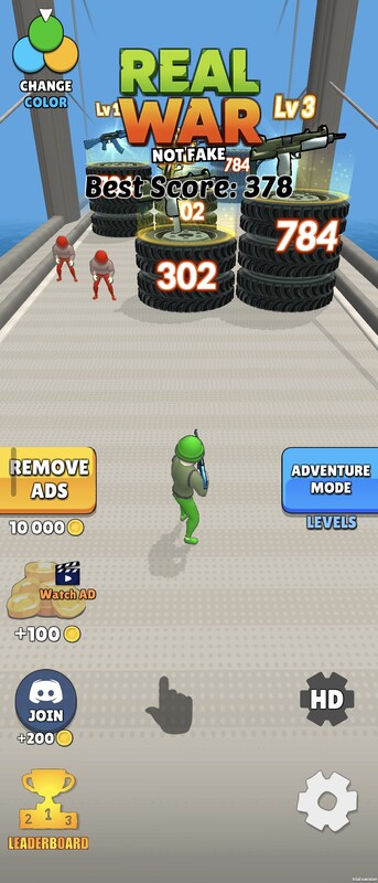 O Real War tem dois modos de jogo: um modo infinito que acompanha sua pontuação máxima (a minha é 378) e um modo de aventura em que o jogador completa os níveis e ganha moedas. As moedas podem ser usadas para remover anúncios - uma façanha que pode levar algum tempo para ser concluída, já que passar de um nível dá direito a 10 moedas e remover anúncios custa 10.000. Há outras maneiras de ganhar moedas, como participar do Discord do desenvolvedor por meio de uma opção na tela do menu do jogo, que recompensa 200 moedas, ou assistir a anúncios por 100 moedas.