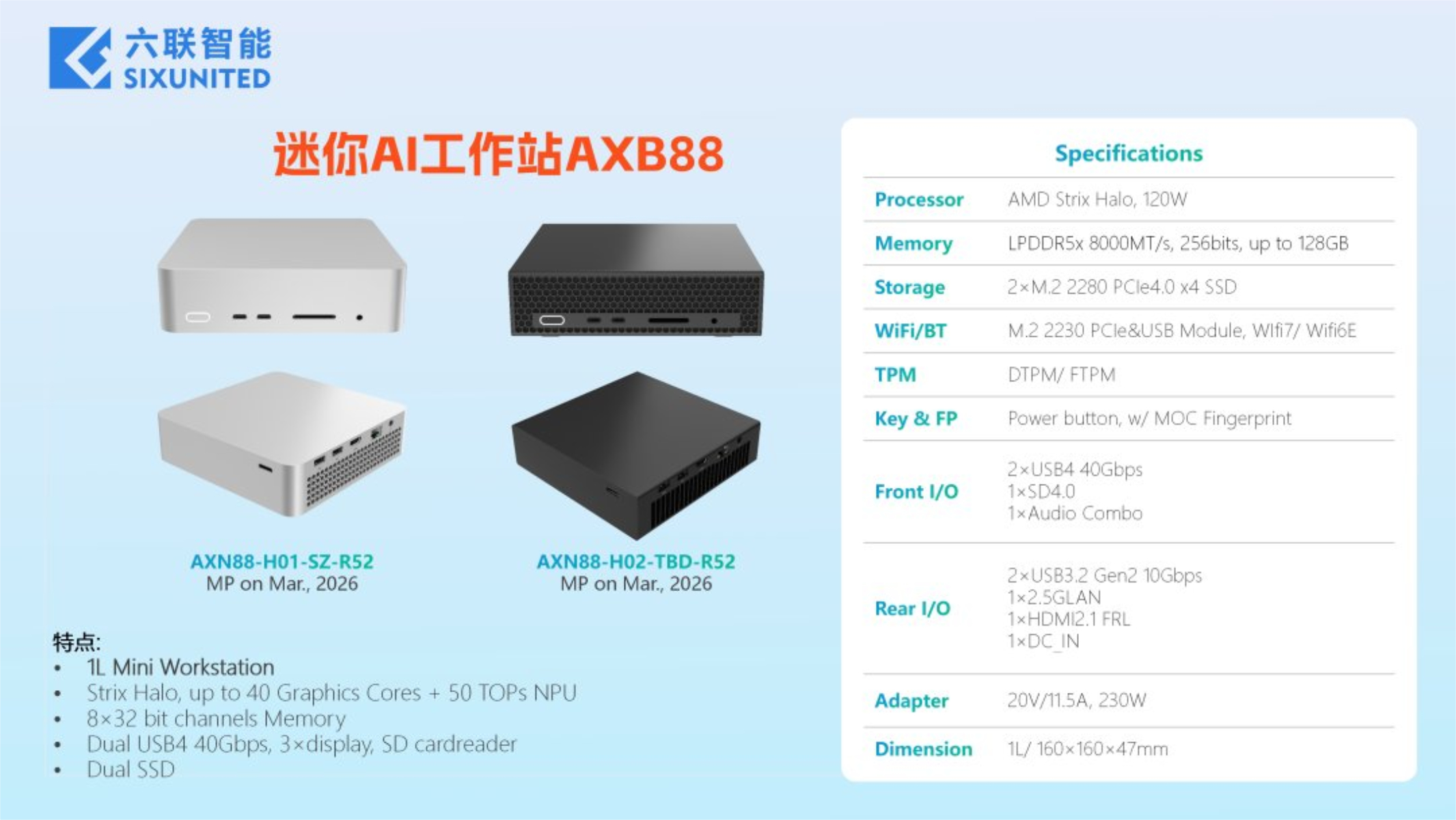 Ao mesmo tempo, a empresa também apresentou dois mini-PCs apoiados pela mesma arquitetura. Enquanto esses apresentavam gabinetes de 2 litros e de 4 litrosrespectivamente, a Sixunited afirma ter ficado ainda menor com o Mini AI Workstation AXB88. Como mostra o gráfico abaixo, o AXB88 mede 160 x 160 x 47 mm, independentemente dos dois acabamentos mostrados, o que é muito menor do que os minicomputadores Strix Halo concorrentes, como o GMKtec EVO-X2 (atualmente em US$ 1.699 na Amazon).