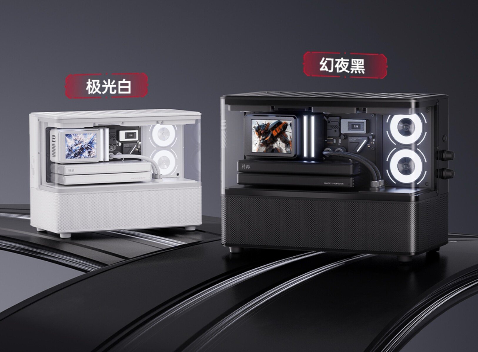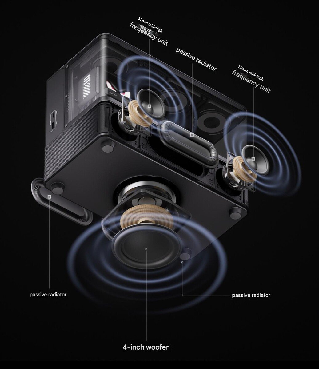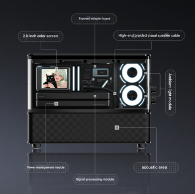 Os cabos grossos e trançados dos alto-falantes lembram os dutos de um sistema de resfriamento líquido, enquanto a tela sensível ao toque de 2,8 polegadas simboliza o cooler da CPU. Essa tela pode não apenas exibir gráficos e animações, mas também mostrar a carga atual da CPU e da GPU, bem como o uso da RAM de um computador conectado, tornando a ilusão ainda mais eficaz. Na parte traseira do alto-falante, há uma porta USB-C e uma USB-A, cada uma capaz de carregar dispositivos conectados com até 35 watts