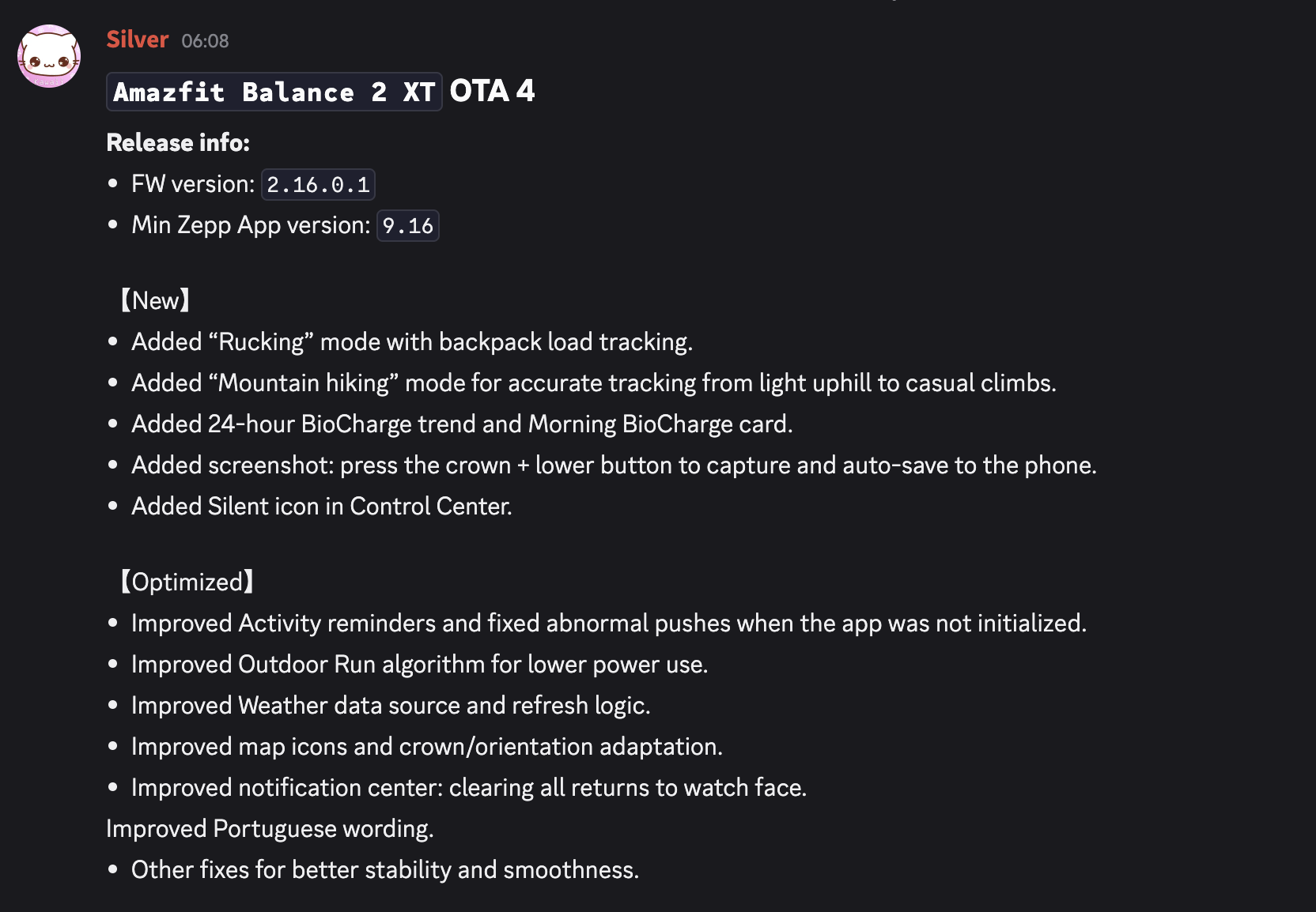 Anunciada no Zepp Health Discorda atualização mais recente é chamada de lançamento Amazfit Balance 2 XT OTA 4, ou versão de firmware 2.16.0.1. Ela traz uma série de novos recursos para esse smartwatch, incluindo dois novos modos de treino: Rucking e Mountain Hiking. Há duas ferramentas relacionadas ao monitoramento de energia BioCharge: uma tendência BioCharge de 24 horas e um cartão BioCharge matinal.