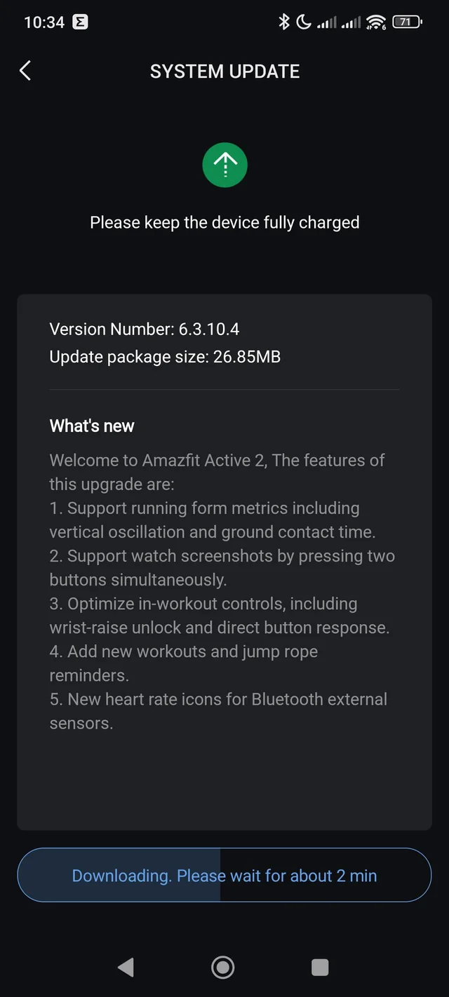 No entanto, essa versão não chegou aos usuários do Amazfit Active 2 (Round) como esperado. Pode ter havido um bug nessa atualização, o que explica o adiamento do lançamento e o número de versão mais alto. O registro de alterações da versão 6.3.10.4 do software foi compartilhado por um usuário em Redditlistando os mesmos recursos que estavam programados para chegar na atualização anterior OTA 4.1. Esses recursos incluem métricas avançadas de corrida, como oscilação vertical e tempo de contato com o solo, bem como um novo modo de treino para ultramaratona e lembretes de pular corda.