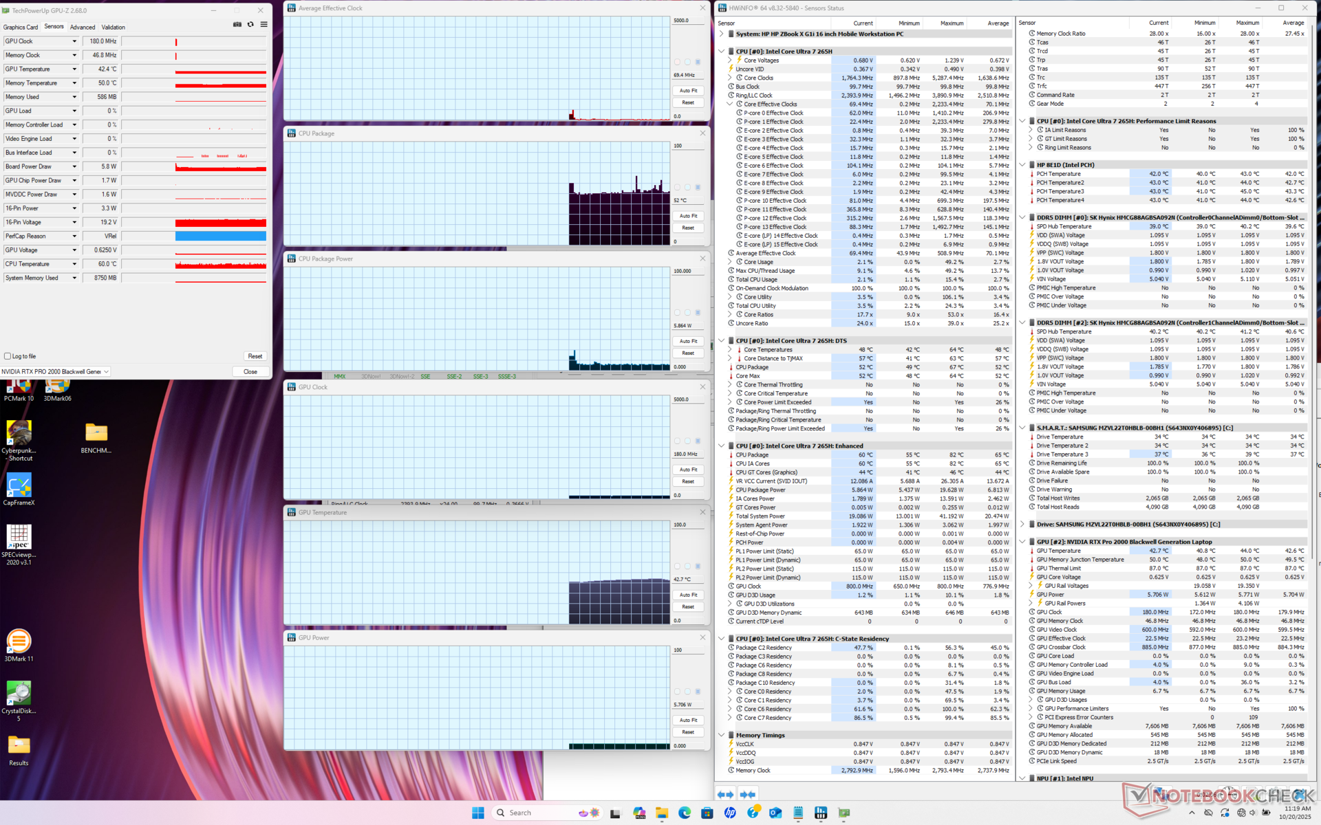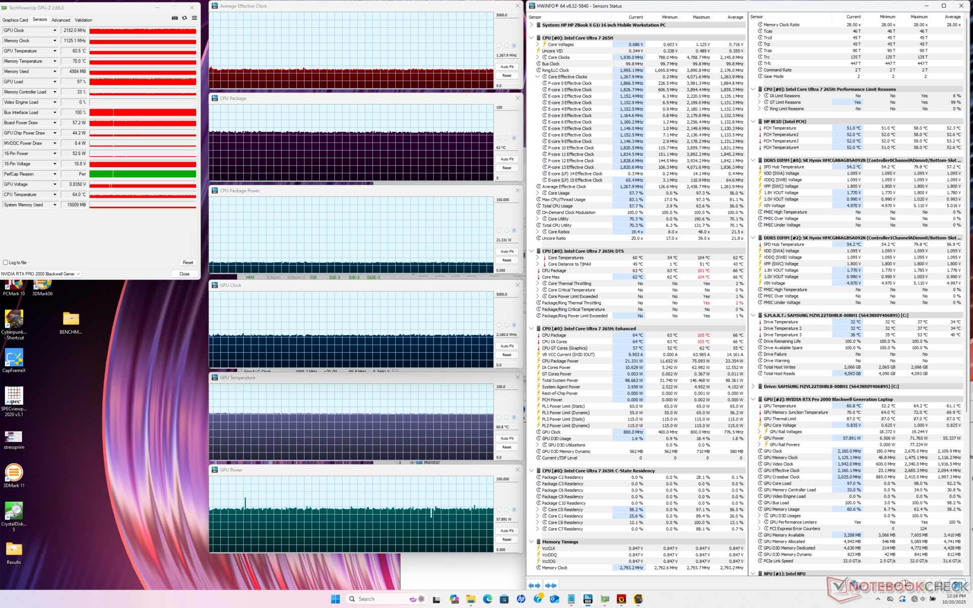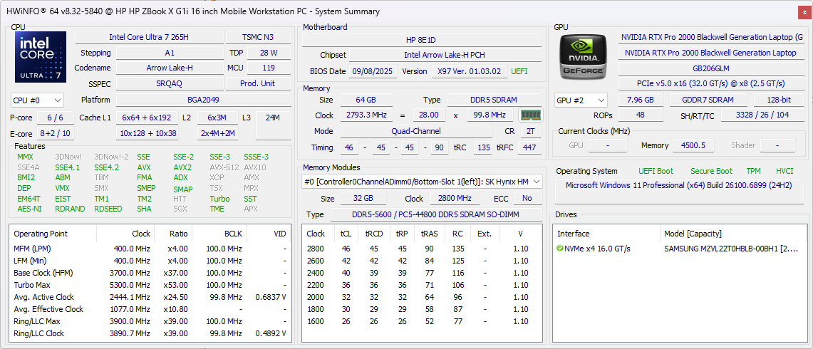 | HP ZBook X G1i 16 Ultra 7 265H, RTX PRO 2000 Blackwell Generation Laptop, Samsung PM9A1 MZVL22T0HBLB, IPS, 2560x1600, 16" | HP ZBook Power 16 G11 A R7 8845HS, NVIDIA RTX 2000 Ada Generation Laptop, Samsung PM9A1 MZVL22T0HBLB, IPS, 2560x1600, 16" | HP ZBook Studio 16 G11 Ultra 9 185H, NVIDIA RTX 3000 Ada Generation Laptop, Kioxia XG8 KXG80ZNV1T02, IPS, 3840x2400, 16" | Lenovo ThinkPad P16 Gen 2 i7-14700HX, NVIDIA RTX 4000 Ada Generation Laptop, SK hynix PC801 HFS001TEJ9X162N, IPS, 2560x1600, 16" | Dell Pro Max 16 Plus Ultra 9 285HX, RTX PRO 5000 Blackwell Generation Laptop, SK hynix PCB01 HFS001TFM9X186N, OLED, 3840x2400, 16" | Dell Precision 5690 Ultra 9 185H, NVIDIA RTX 5000 Ada Generation Laptop, 2x Samsung PM9A1 1TB (RAID 0), OLED, 3840x2400, 16" | |