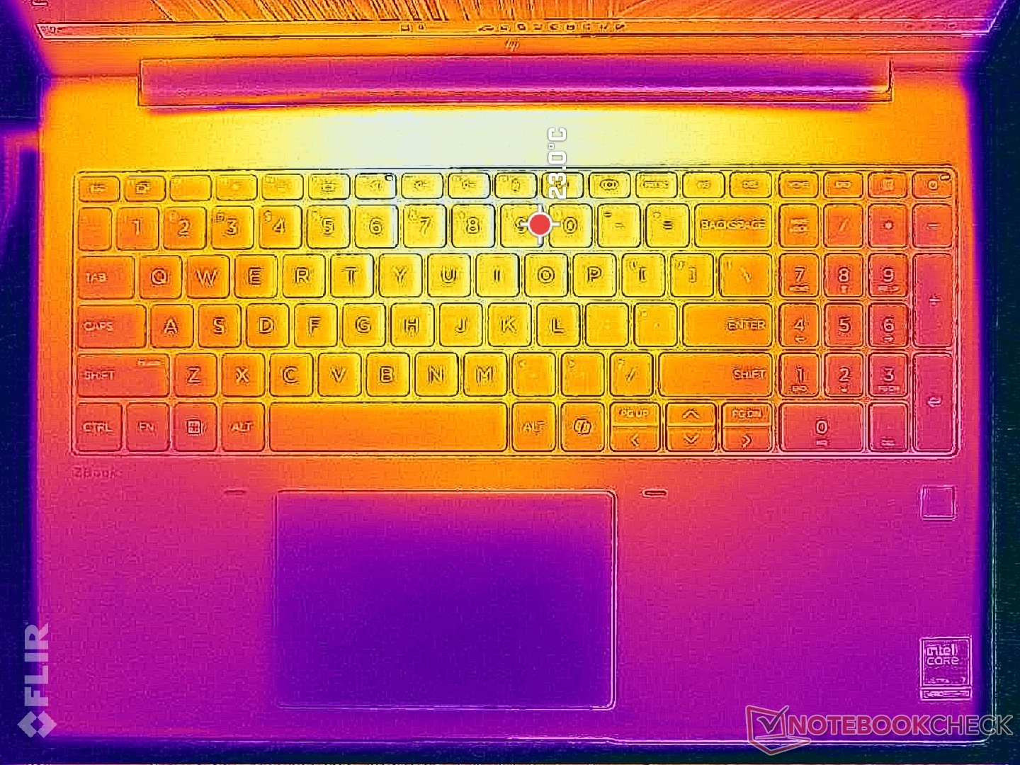 (+) Os apoios para as mãos e o touchpad são mais frios que a temperatura da pele, com um máximo de 24.2 °C / 75.6 F e, portanto, são frios ao toque.
