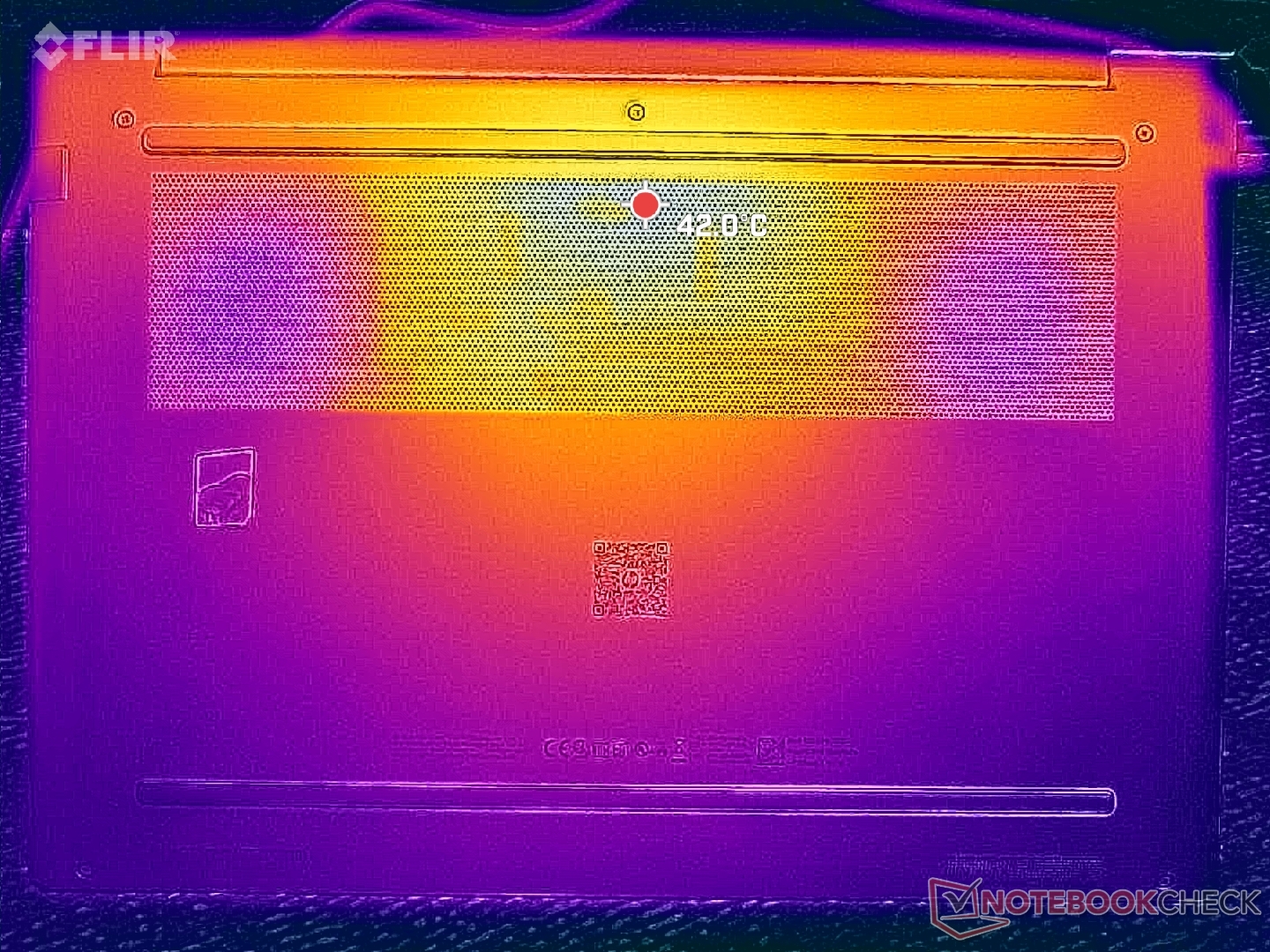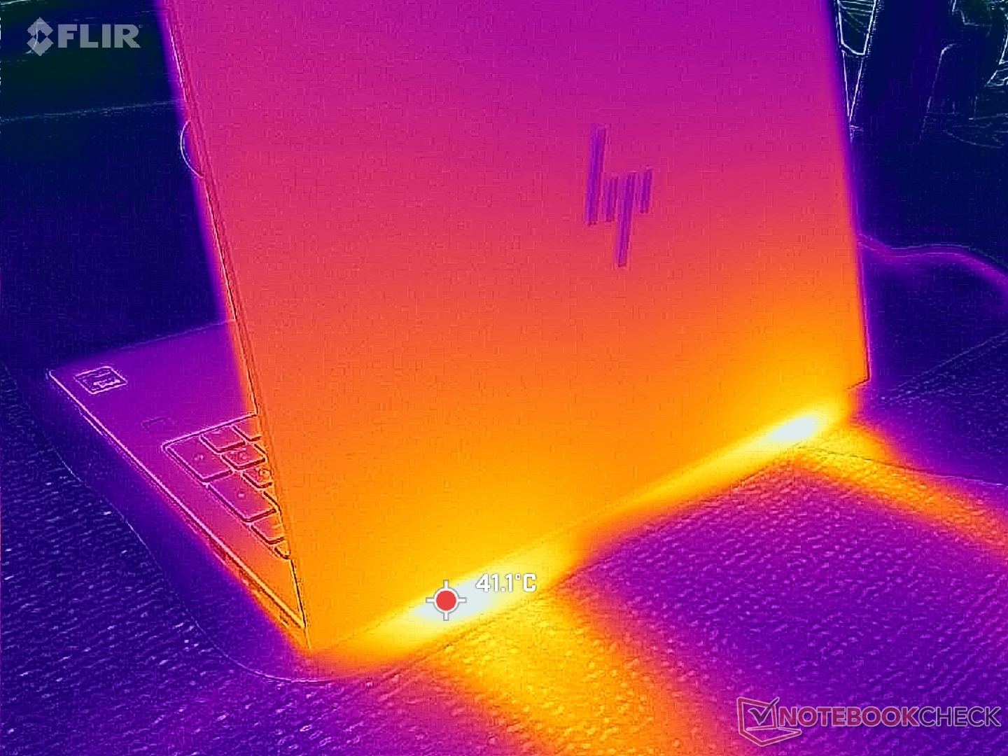 O desenvolvimento da temperatura da superfície é mais quente em direção ao centro, onde pode chegar a mais de 36 C ao executar cargas exigentes, o que é significativamente mais frio do que o que registramos no ThinkPad P16 Gen 2 ou Dell Precision 5690.