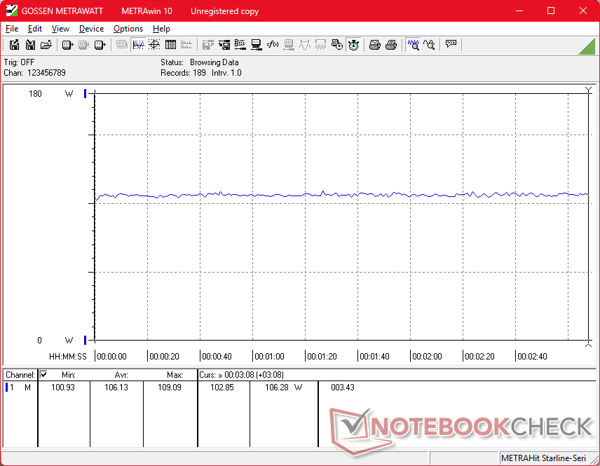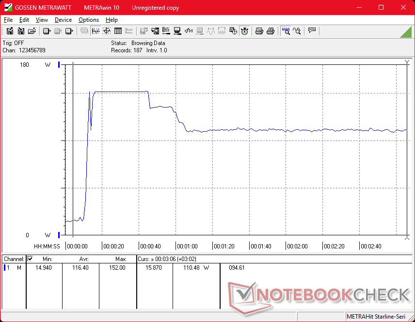 Conseguimos medir um consumo máximo temporário de 153 W do pequeno adaptador CA de 150 W (~13,8 x 6,5 x 2,2 cm) quando a CPU e a GPU estão totalmente estressadas.