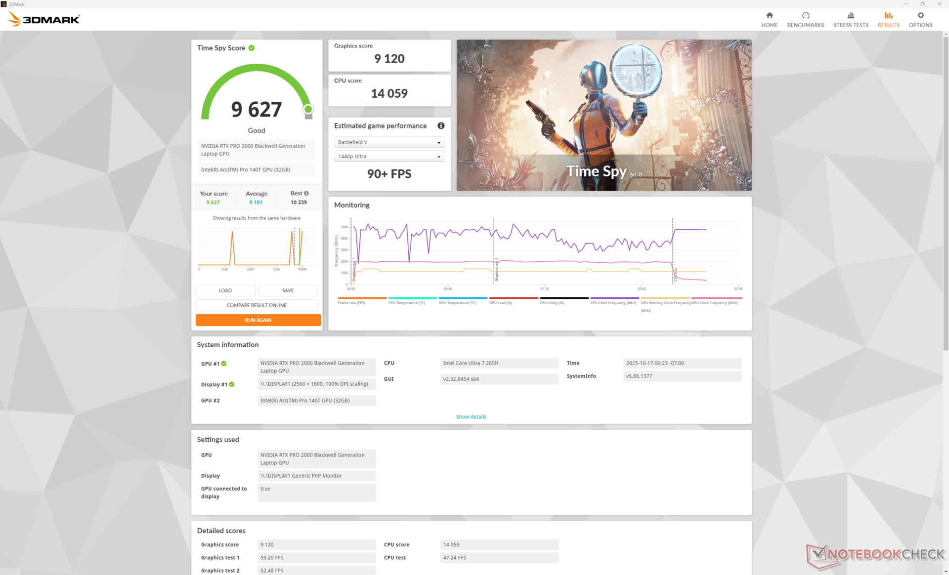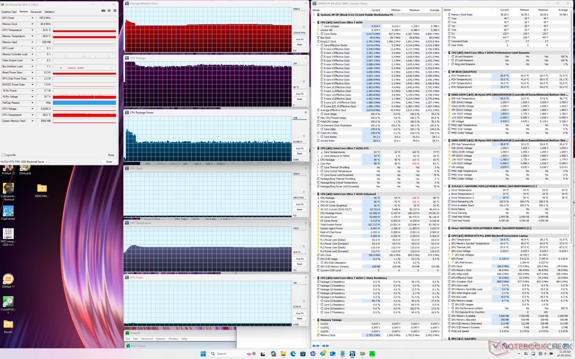A CPU aumentaria para 3,6 GHz, 108 W e 104 °C ao iniciar o estresse do Prime95 antes de cair e se estabilizar em 3,0 GHz, 62 W e 88 °C apenas alguns instantes depois para representar a sustentabilidade máxima limitada do Turbo Boost. É interessante notar que as taxas de clock da CPU alternavam enquanto as taxas de clock da GPU permaneciam constantes ao executar o Prime95 e o FurMark simultaneamente.
