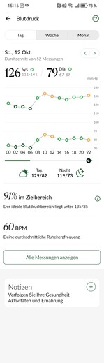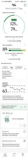 A gama completa de funções só está disponível para os usuários da Hilo Band se eles fizerem uma assinatura (EUR5,99 / CAD $6,99 / AUS $9,99 / £4,99 por mês), que amplia a gama padrão para incluir uma comparação detalhada do eixo de tempo, tempos na faixa-alvo, anotações e rastreamento de medicamentos. A medição em si funciona bem, um relatório de pressão arterial pode ser exportado como PDF e as medições dos últimos 7 dias podem ser visualizadas em detalhes. Os dados podem ser sincronizados mensalmente com o Apple Health e o Health Connect, se o senhor desejar, ou diariamente com uma assinatura.