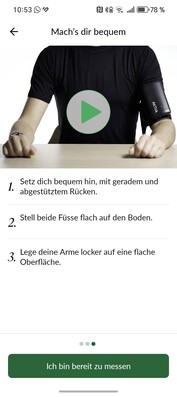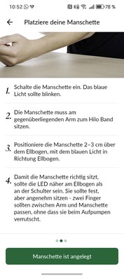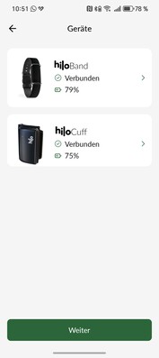 O manguito fornecido (Bluetooth 4.2) é usado para essa finalidade e pode ser facilmente emparelhado no aplicativo. Depois que o aplicativo reconhece que os dois dispositivos estão conectados, o processo de calibração pode ser iniciado, sendo guiado passo a passo. Opcionalmente, também podem ser reproduzidos vídeos para explicar novamente as etapas individuais. A calibração é realizada por meio de três medições consecutivas, com a pulseira Hilo usada na mão mais fraca e o manguito no lado oposto. Isso funciona sem problemas na análise e achamos a configuração muito clara e fácil de executar, mesmo para pessoas com menos experiência técnica.