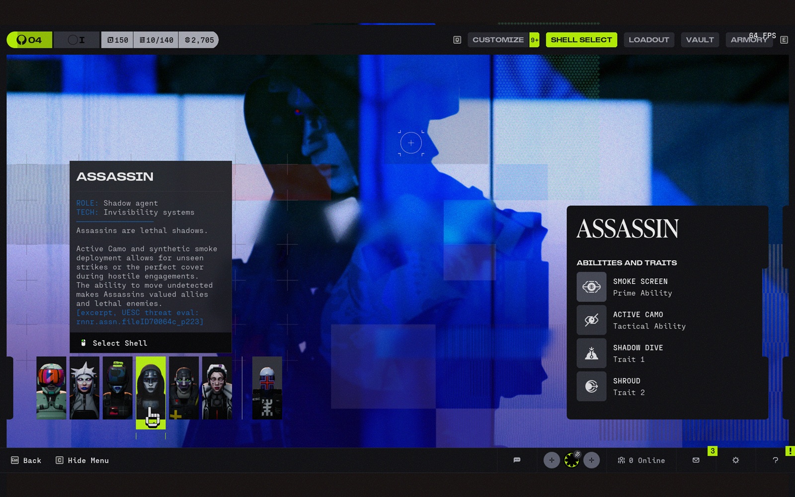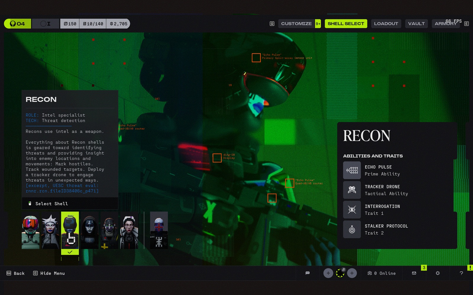 Essa identidade visual também aparece fora das partidas. As telas das conchas pré-corrida parecem elegantes, blindadas, sintéticas e ligeiramente impessoais, mais como corpos especializados fabricados para a função do que como personagens heróicos construídos para a autoexpressão. O revestimento escuro, as silhuetas rígidas, os designs com viseira pesada e os menus com moldura de neon reforçam a mesma ideia: são ferramentas que estão sendo implantadas em um sistema hostil. Isso combina muito mais com o mundo de Marathondo que uma apresentação mais convencional de herói e atirador.