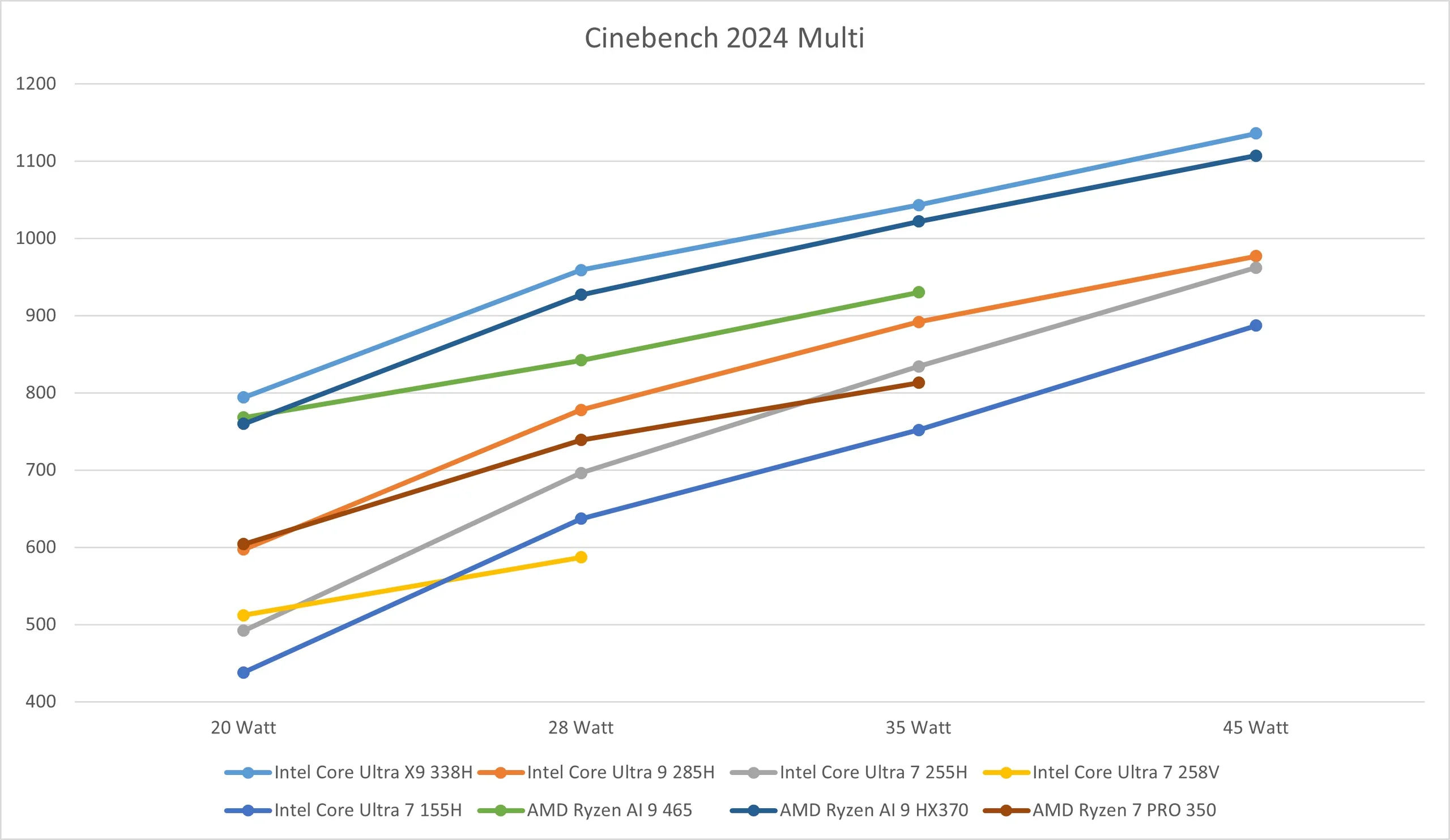 Quando se trata de eficiência de vários núcleos, o senhor precisa observar os valores de TDP, bem como o desempenho puro. Para o X9 388H, além dos limites de potência padrão, também realizamos medições com limites de potência fixos de 20, 28, 35 e 45 watts. Também realizamos medições adicionais para o novo Ryzen AI 9 465 a 20, 28 e 35 watts. Obviamente, a eficiência aumenta com limites de potência mais baixos.