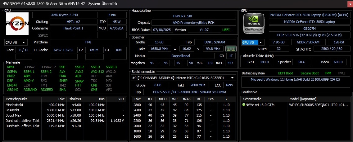 | Acer Nitro V 16 AI ANV16-42-R860 AMD Ryzen 5 240 ⎘ NVIDIA GeForce RTX 5050 Laptop ⎘ 16 GB Memória, 1024 GB SSD | Amazon: $989.00 Preço de tabela: 1100 EUR | 2.4 kg | 24.5 mm | 16.00" 1920x1200 142 PPI IPS | |