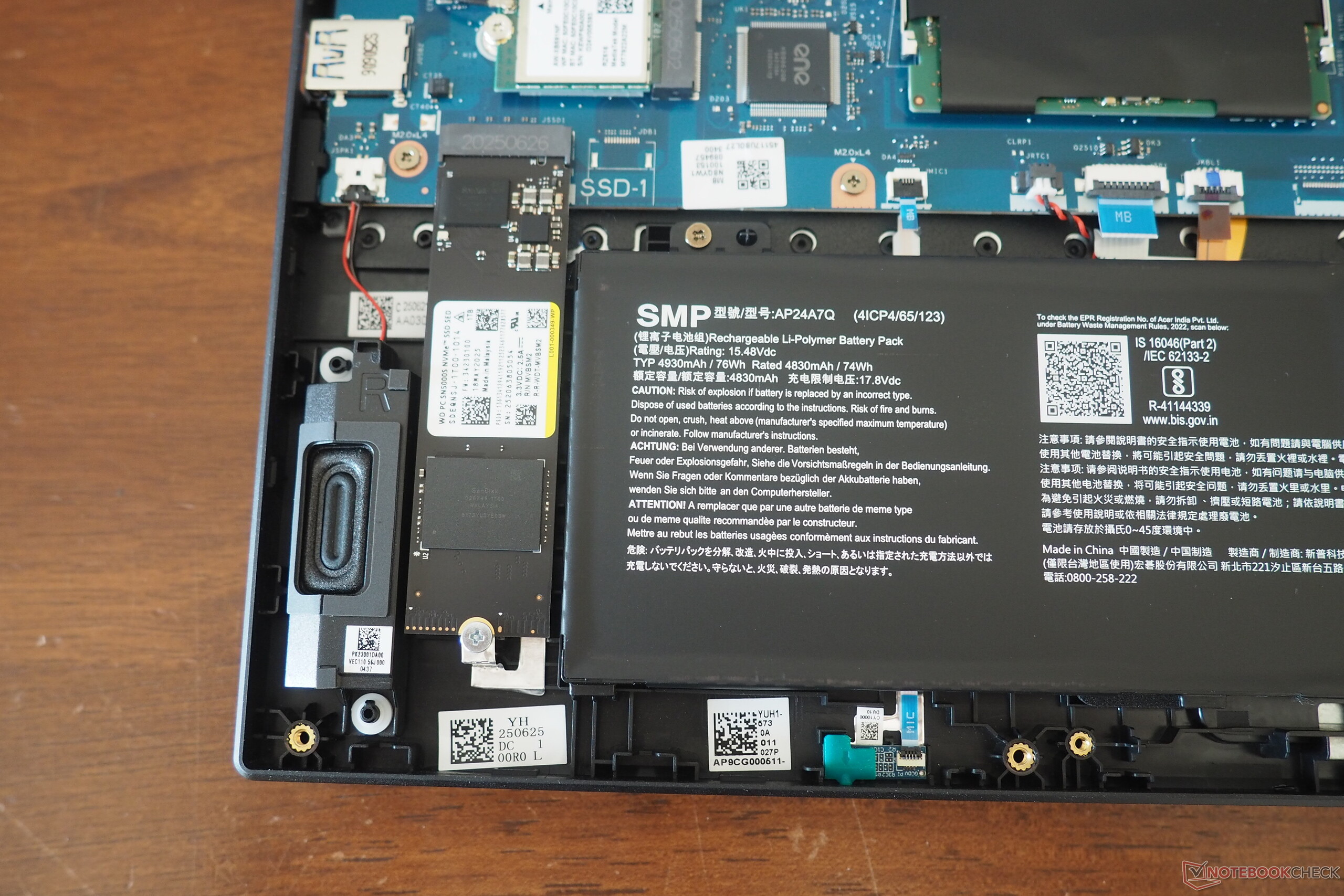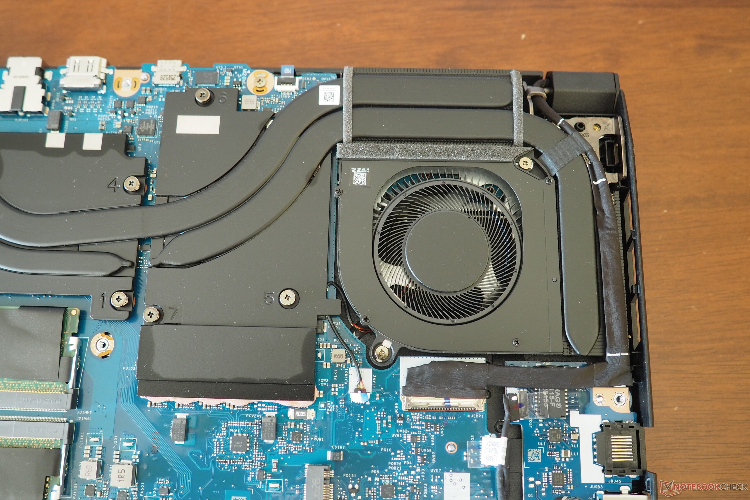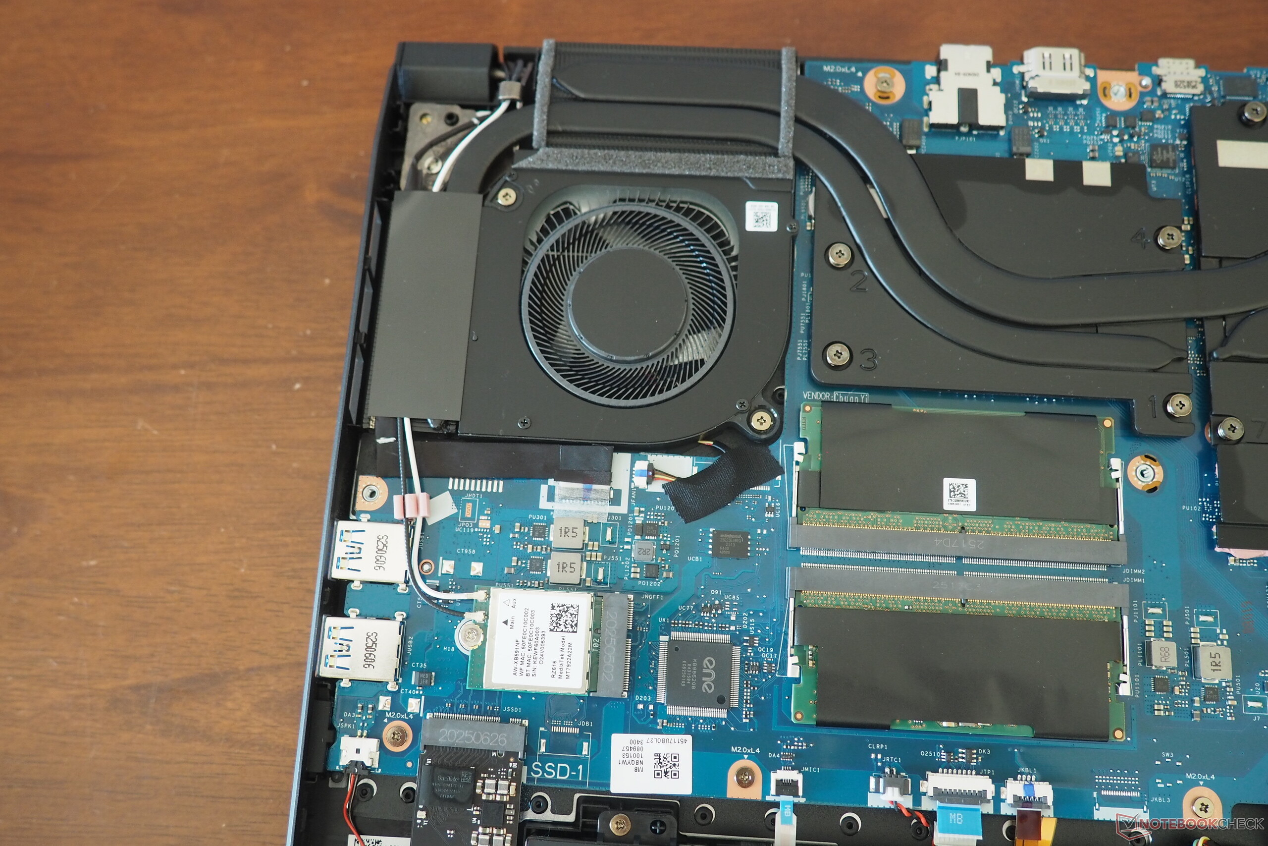 É necessário soltar um total de 10 parafusos Phillips para acessar o funcionamento interno. Sob o capô, além do sistema de resfriamento com suas duas ventoinhas, há também o módulo sem fio, a bateria, dois SO-DIMM e dois slots M.2.