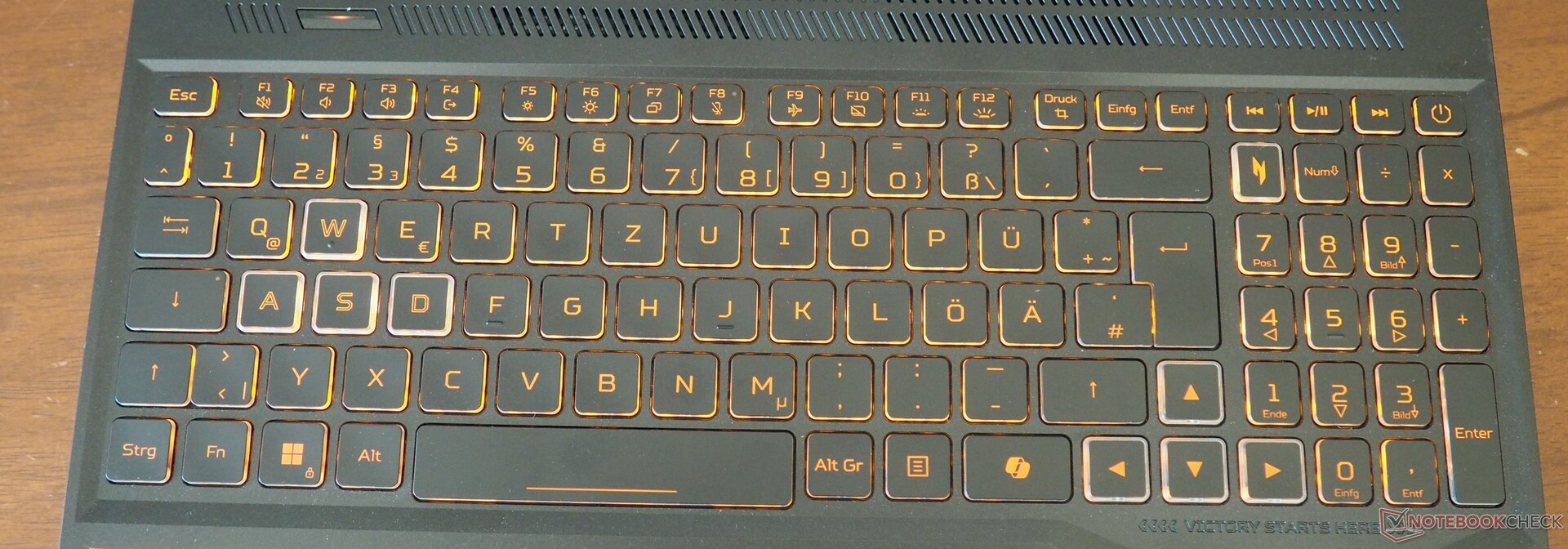 O ângulo máximo de abertura de aproximadamente 145° é maior do que o normalmente visto nessa classe. A iluminação do teclado é laranja para combinar com a cor das letras nas teclas.