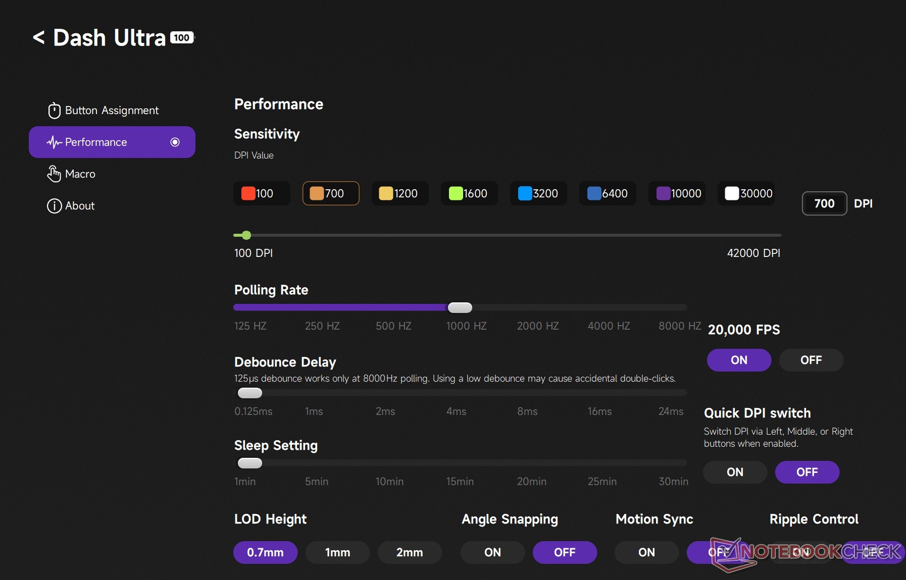 Todos os botões principais do mouse para jogos sem fio podem ser remapeados e, na seção "Desempenho", há uma opção que permite a troca rápida de DPI. Os usuários também podem habilitar o ajuste de ângulo, permitindo movimentos em linha reta mais nítidos que podem proporcionar uma vantagem competitiva em jogos FPS.
