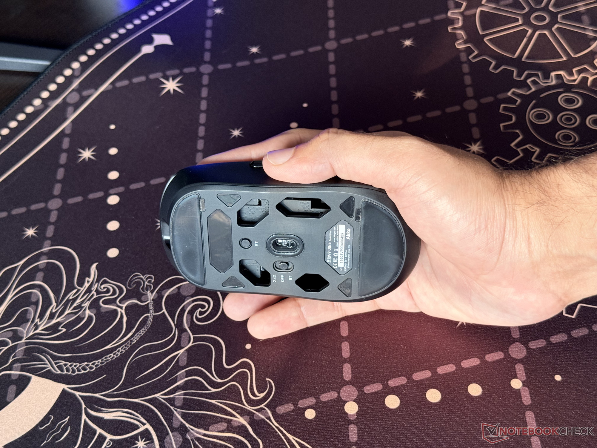 Como a Akko destaca, a versão preta do mouse para jogos, que tenho aqui para análise, pesa apenas 40 gramas, enquanto a versão branca pesa cerca de 41 gramas. A parte inferior aberta e o tamanho menor contribuem para esse design leve.