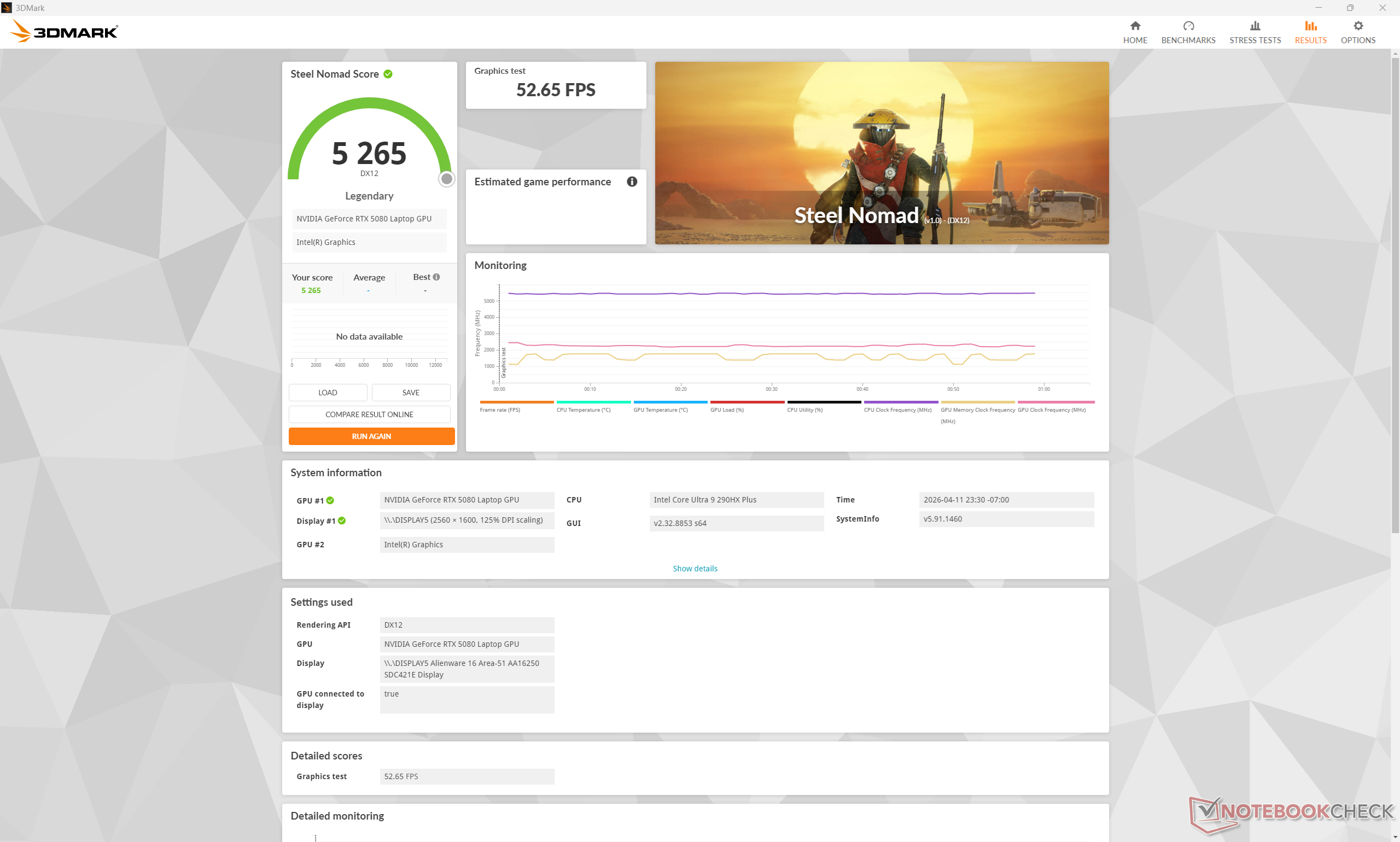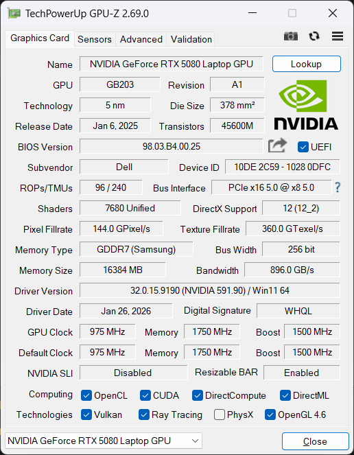| Alienware 16 Area-51 Core Ultra 9 290HX Plus GeForce RTX 5080 Laptop, SK hynix PCB01 HFS001TFM9X186N, OLED, 2560x1600, 16" | Alienware 16 Area-51 Ultra 9 275HX, GeForce RTX 5080 Laptop, Samsung PM9C1a MZ9L81T0HDLB, IPS, 2560x1600, 16" | Lenovo Legion Pro 7i 16 Gen 10 Ultra 9 275HX, GeForce RTX 5080 Laptop, SK Hynix HFS001TEJ9X115N, OLED, 2560x1600, 16" | HP Omen Max 16 ah000 Ultra 9 275HX, GeForce RTX 5090 Laptop, WDC PC SN810 2TB, OLED, 2560x1600, 16" | MSI Vector 16 HX AI A2XWHG Ultra 7 255HX, GeForce RTX 5070 Ti Laptop, Micron 2400 MTFDKBA512QFM, IPS, 2560x1600, 16" | Asus ROG Zephyrus G16 GU605CW Ultra 9 285H, GeForce RTX 5080 Laptop, Micron 2500 2TB MTFDKBA2T0QGN-1BN1AABGA, OLED, 2560x1600, 16" | |