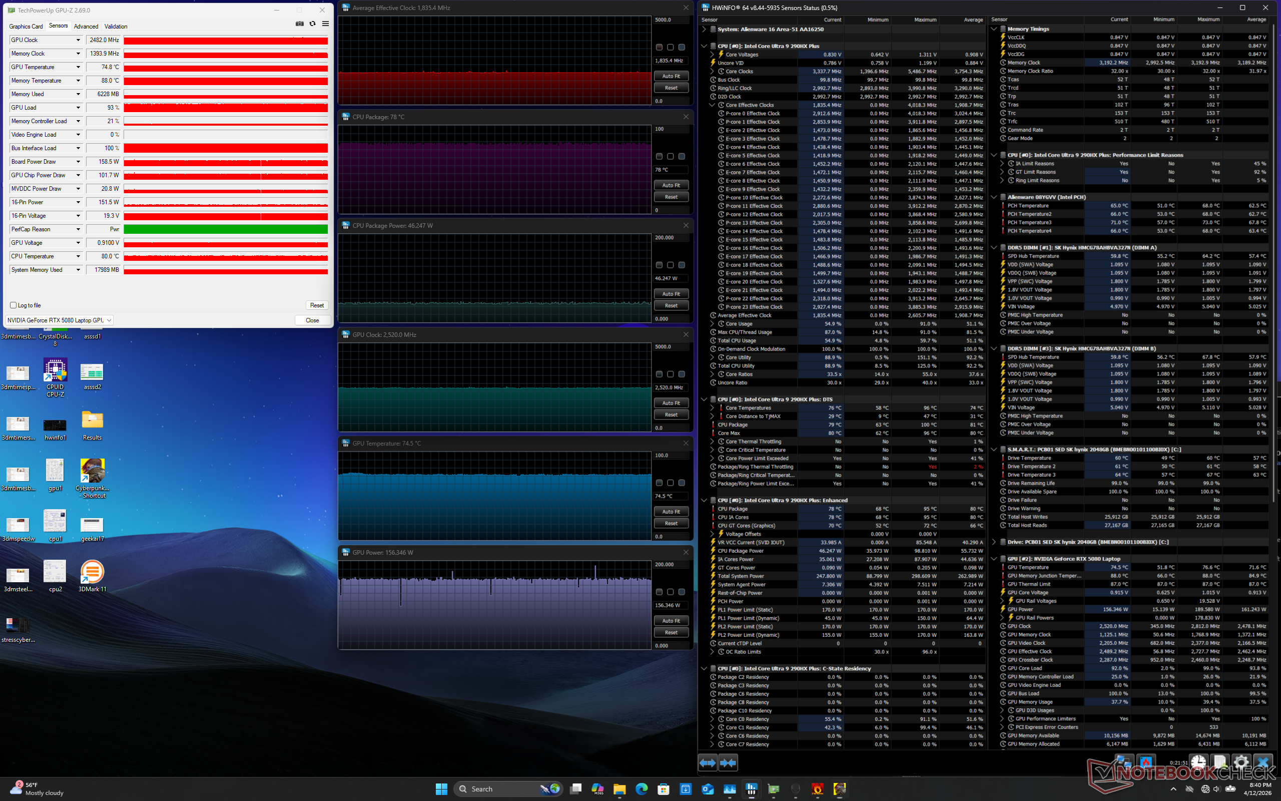 Ao executar o estresse do Prime95 no modo Overdrive (ou seja, modo de ventilador máximo), a CPU aumentaria para 4,3 GHz, 182 W e 105 C (!) antes de cair um pouco para a faixa de 3,9 a 4,1 GHz a fim de manter uma temperatura central um pouco mais fria de 95 C a 100 C. Em comparação, a execução desse mesmo teste no Alienware 16 de 2025 resultaria em uma taxa de clock e temperatura média da CPU mais baixas de 3,6 GHz e 92 C, respectivamente. Está claro que o Core Ultra 9 290HX Plus está levando a solução de resfriamento existente do Alienware 16 aos seus limites absolutos.