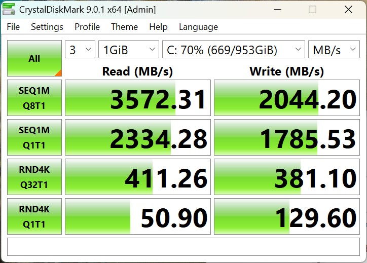 O Alliwava GH8 vem com um SSD de 1 TB, cujo fabricante não foi especificado. Graças à conexão via PCIe 3.0 x4, ele não é um dos modelos mais rápidos e está na extremidade inferior do campo de comparação em termos de desempenho. No entanto, o desempenho é suficiente para as tarefas diárias e a SSD também funciona de forma estável sob carga contínua.