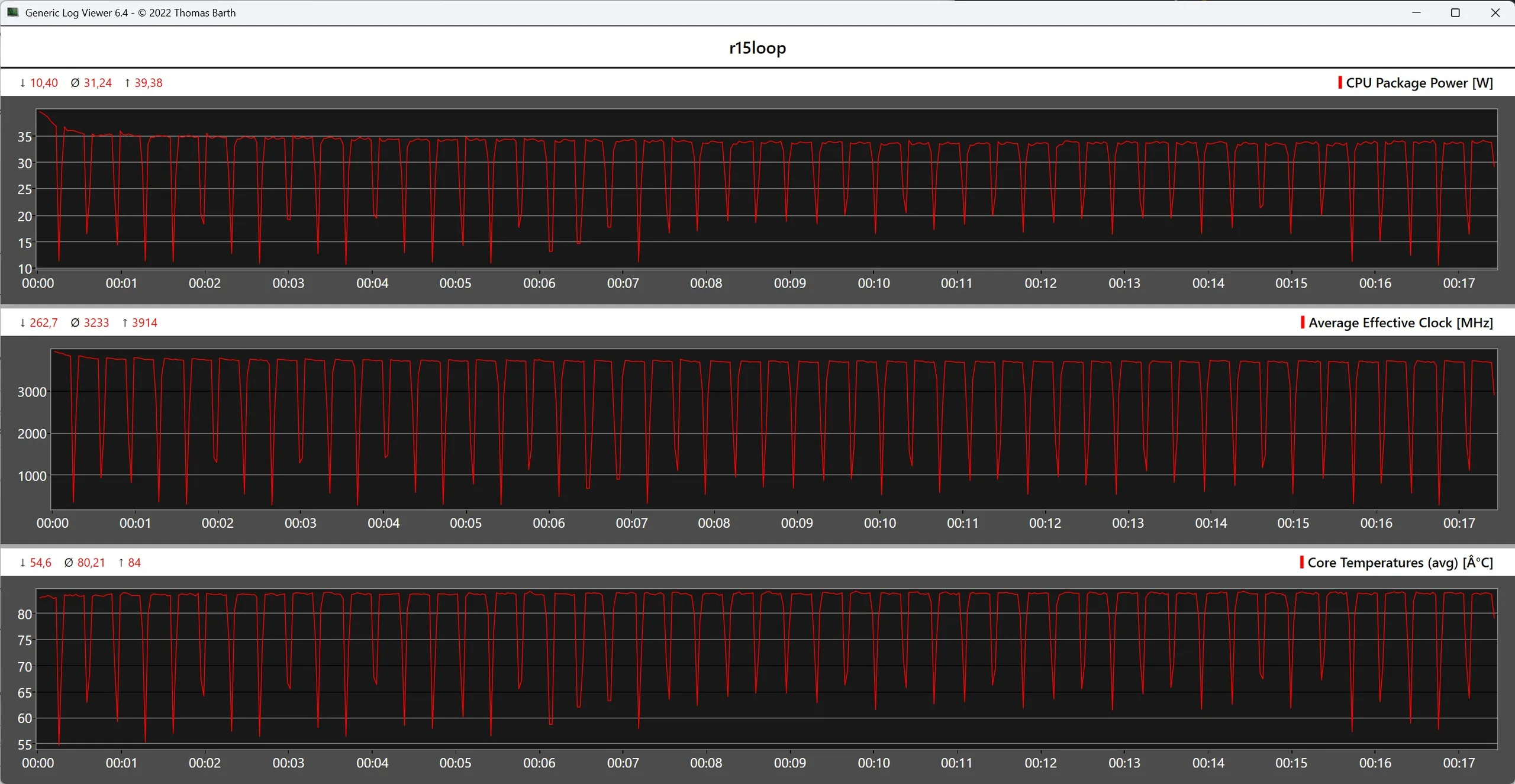 O teste de resistência Cinebench R15 prova que o Alliwava GH8 tem um sistema de resfriamento bem ajustado em geral. Embora não seja possível evitar completamente um leve declínio no desempenho sob carga contínua, ele é moderado. O AMD Ryzen 9 8945HS atinge brevemente um consumo de energia de cerca de 40 watts, enquanto a temperatura máxima é de pouco menos de 84 °C.