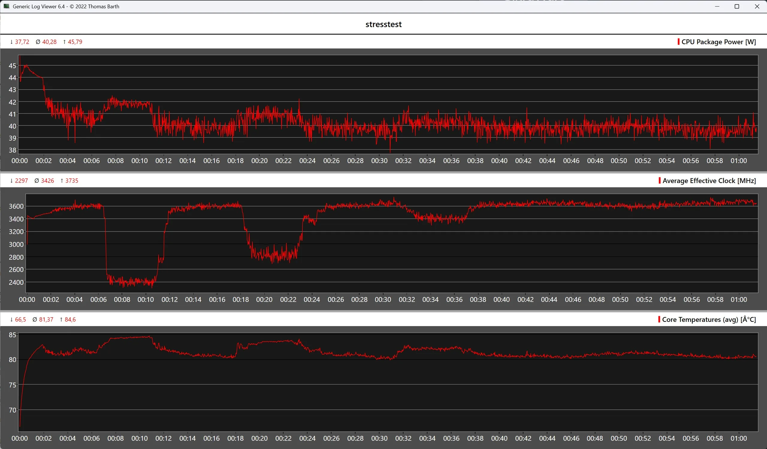 A carcaça do Alliwava GH8 não mostra nenhuma anormalidade extrema, nem no modo inativo nem sob carga contínua. No teste de estresse, o AMD Ryzen 9 8945HS instalado atinge brevemente temperaturas de cerca de 85 C e, portanto, está claramente na faixa não crítica. Um TDP de 40 watts aplicado permanentemente pode ser dissipado de forma confiável pelo sistema de resfriamento, embora a temperatura do SoC se estabilize em torno de 81 °C.
