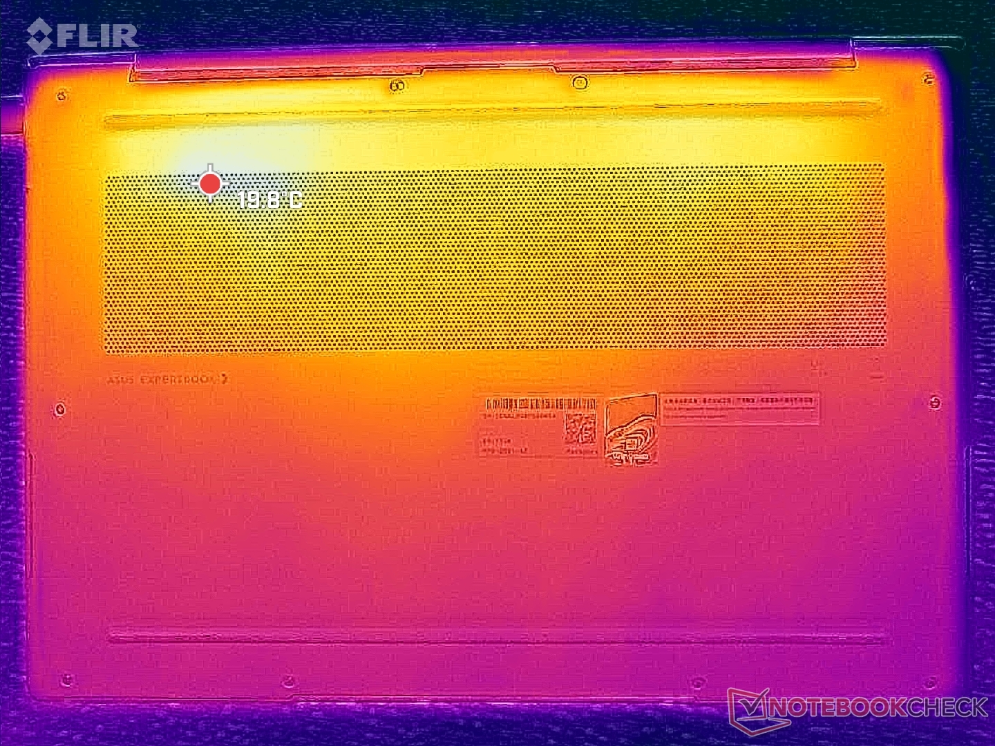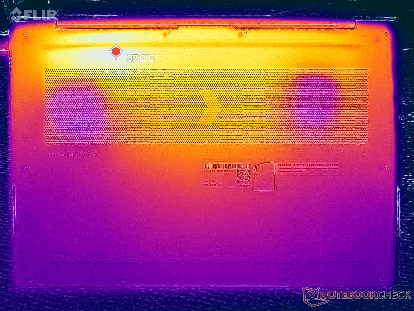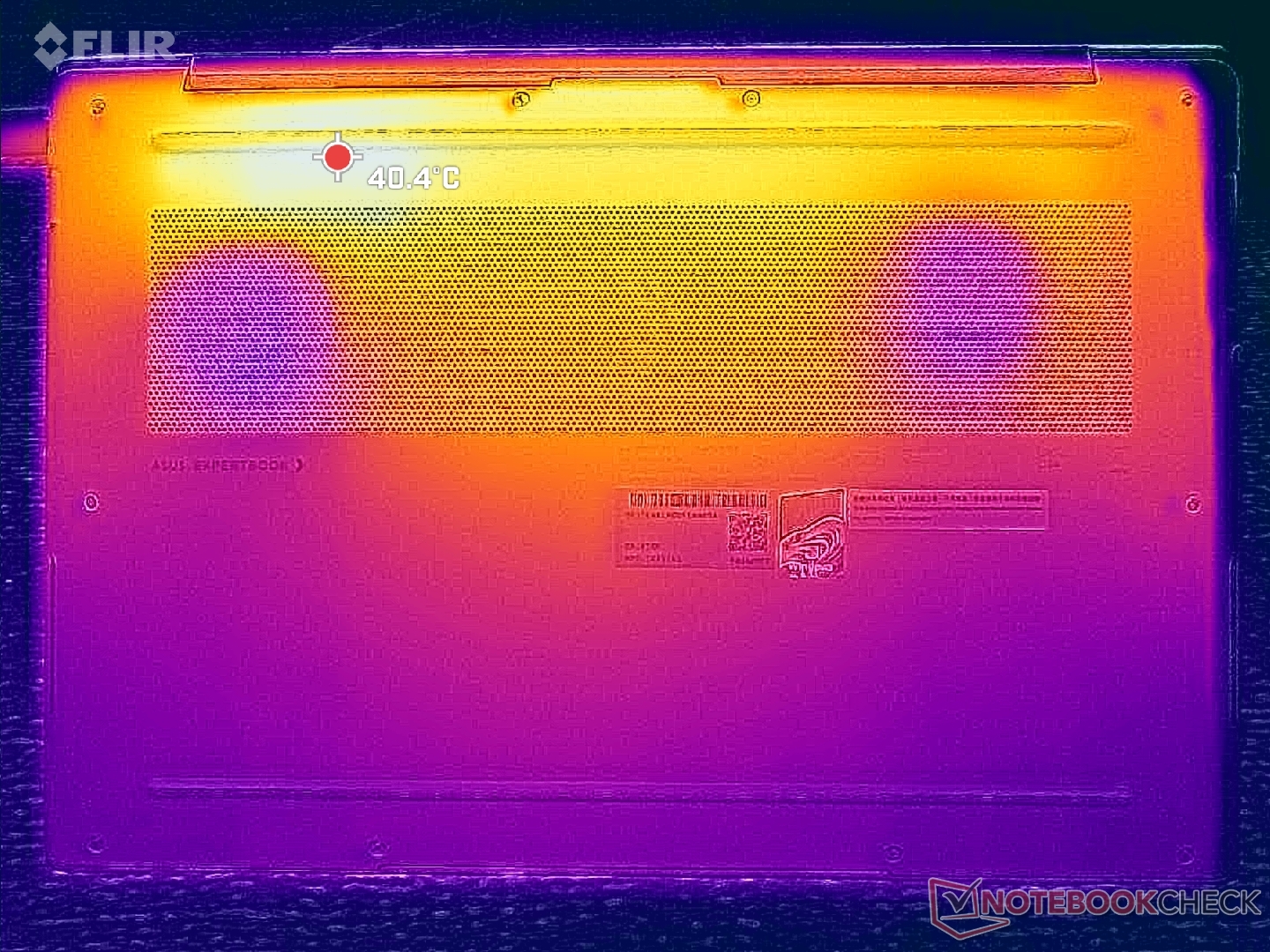O gradiente de temperatura da superfície é mais ou menos simétrico devido à solução de resfriamento que fica embaixo. Os pontos quentes no centro do teclado e no painel inferior podem atingir até 41 °C cada um ao executar cargas exigentes por longos períodos, o que é um pouco mais frio do que no HP EliteBook Ultra G1i 14 equipado com uma CPU Lunar Lake-V mais lenta.