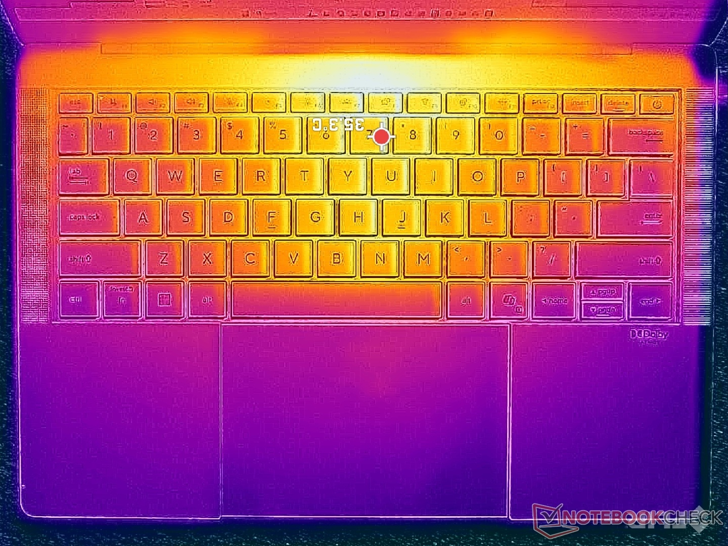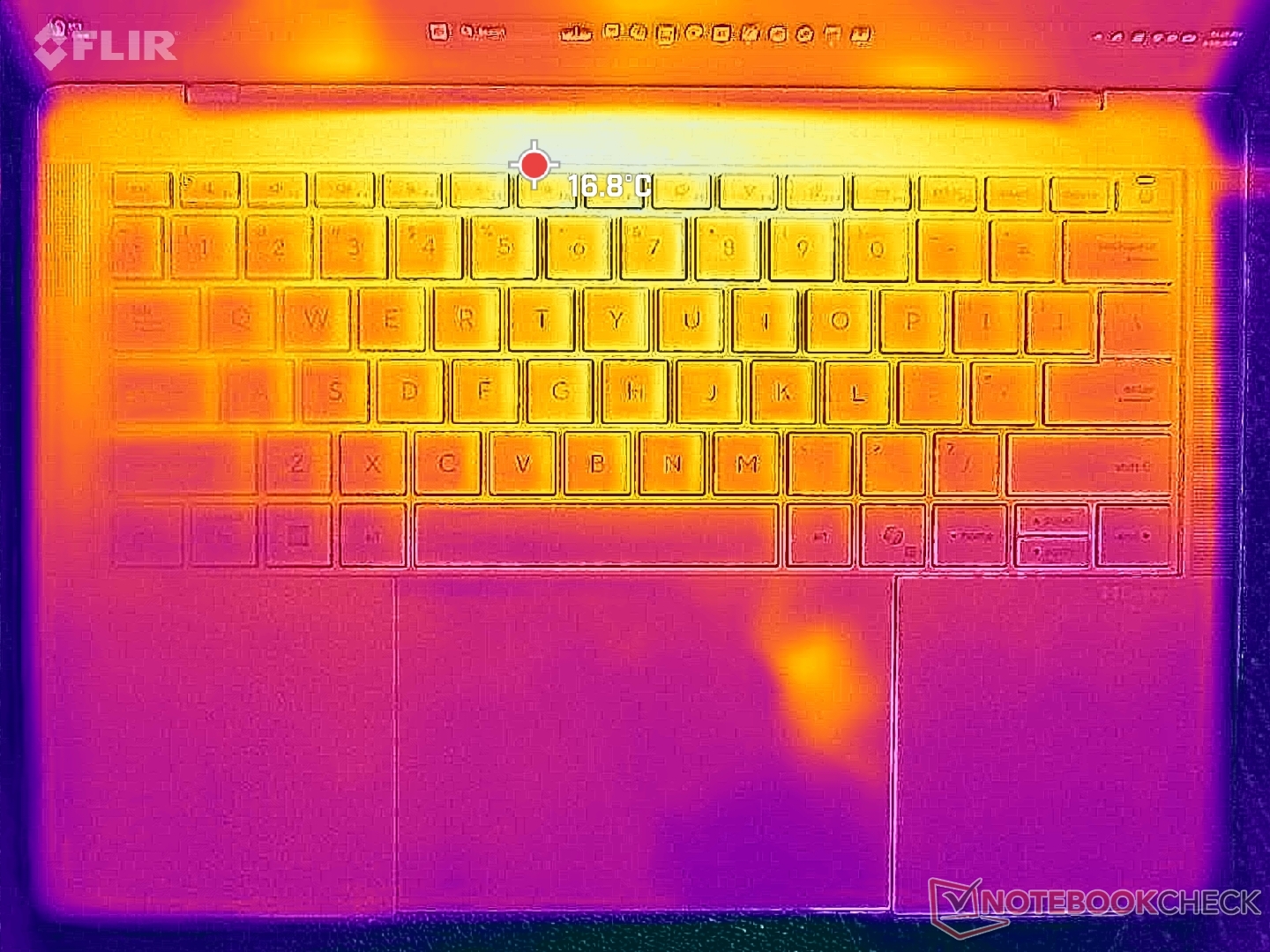 (+) Os apoios para as mãos e o touchpad são mais frios que a temperatura da pele, com um máximo de 26.6 °C / 79.9 F e, portanto, são frios ao toque.