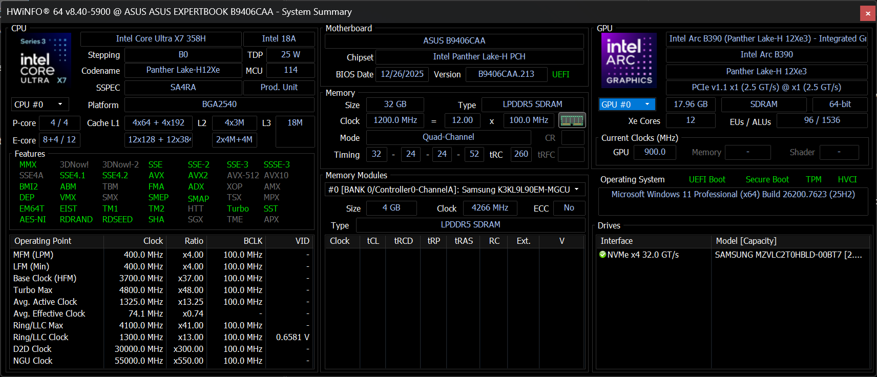 | Asus ExpertBook Ultra B9406CAA Intel Core Ultra X7 358H ⎘ Intel Arc B390 12 Xe3 Panther Lake iGPU ⎘ 32 GB Memória | Amazon: $1,577.99 | 1.1 kg | 15.9 mm | 14.00" 2880x1800 243 PPI OLED | |