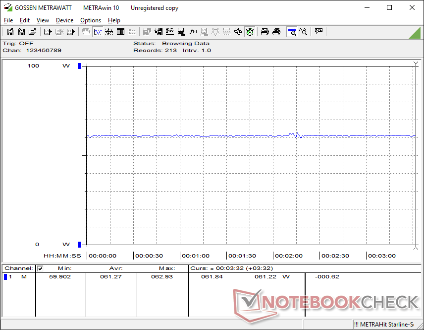 O consumo geral é bastante semelhante ao do Lenovo ThinkPad P14s Gen 6 equipado com Ryzen AI 9, embora com algumas observações importantes. Em primeiro lugar, a execução do Cyberpunk 2077 exige cerca de 61 W em nosso Asus, em comparação com 56 W no Lenovo, apesar de o Arc B890 ter um desempenho até 80% mais rápido, o que representa uma vantagem significativa de desempenho por watt quando se trata de gráficos. Por outro lado, no entanto, a execução do Prime95 consumiria 64 W em média, em comparação com 55 W com o mesmo Lenovo, o que sugere diferenças relativamente pequenas quando se trata do desempenho da CPU por watt.
