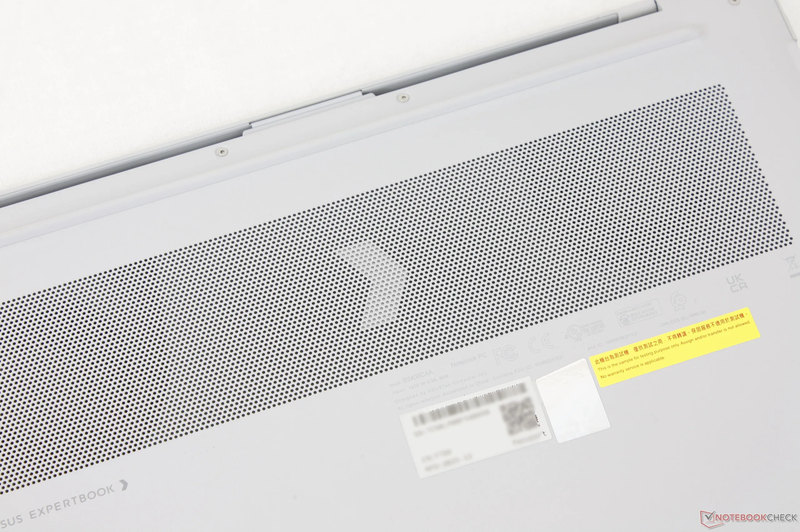 Além de sua aparência atraente, o chassi do ExpertBook Ultra é exclusivo por seu revestimento de "nano cerâmica" 9H, que resiste a arranhões e impressões digitais com mais eficiência do que a liga de metal escovado usual da maioria dos outros notebooks de ponta. Em termos de textura, sua superfície fosca é mais áspera e levemente granulada, em contraste com o brilho superliso e brilhante das alternativas. A rigidez do chassi é mantida em sua maior parte com a certificação MIL-STD 810H e apenas um pouco mais de flexão ao longo da base e da tampa em comparação com algo como o Razer Blade 14.