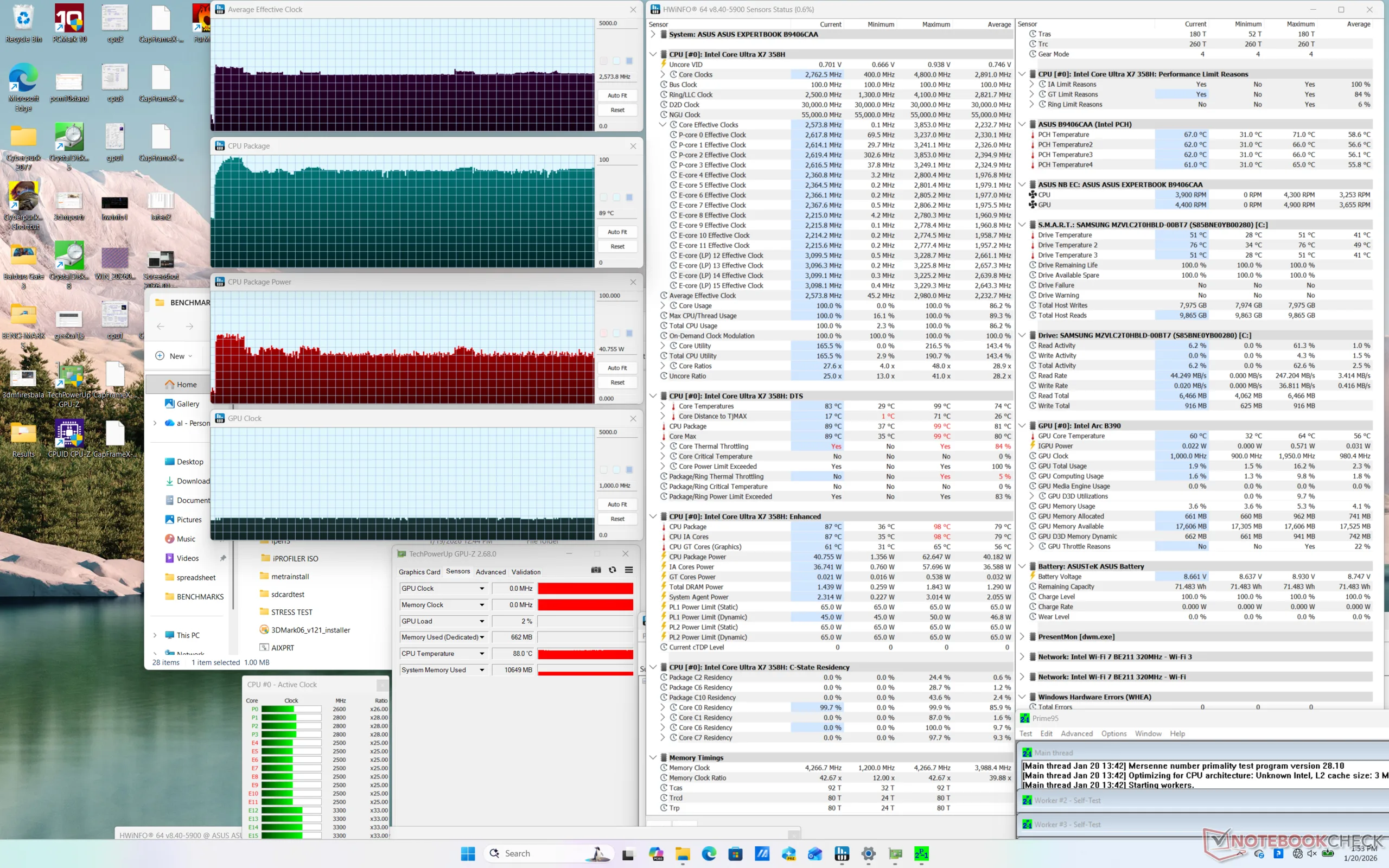 A CPU aumentava para 2,8 GHz e 62 W ao iniciar o estresse do Prime95 antes de atingir uma temperatura de núcleo de 98 C cerca de um minuto depois. Depois disso, o desempenho cairia para 2,6 GHz a fim de manter uma temperatura de núcleo mais gerenciável e um consumo de 85 °C e 48 W, respectivamente. Portanto, o desempenho máximo do Turbo Boost só é sustentável por um tempo limitado.