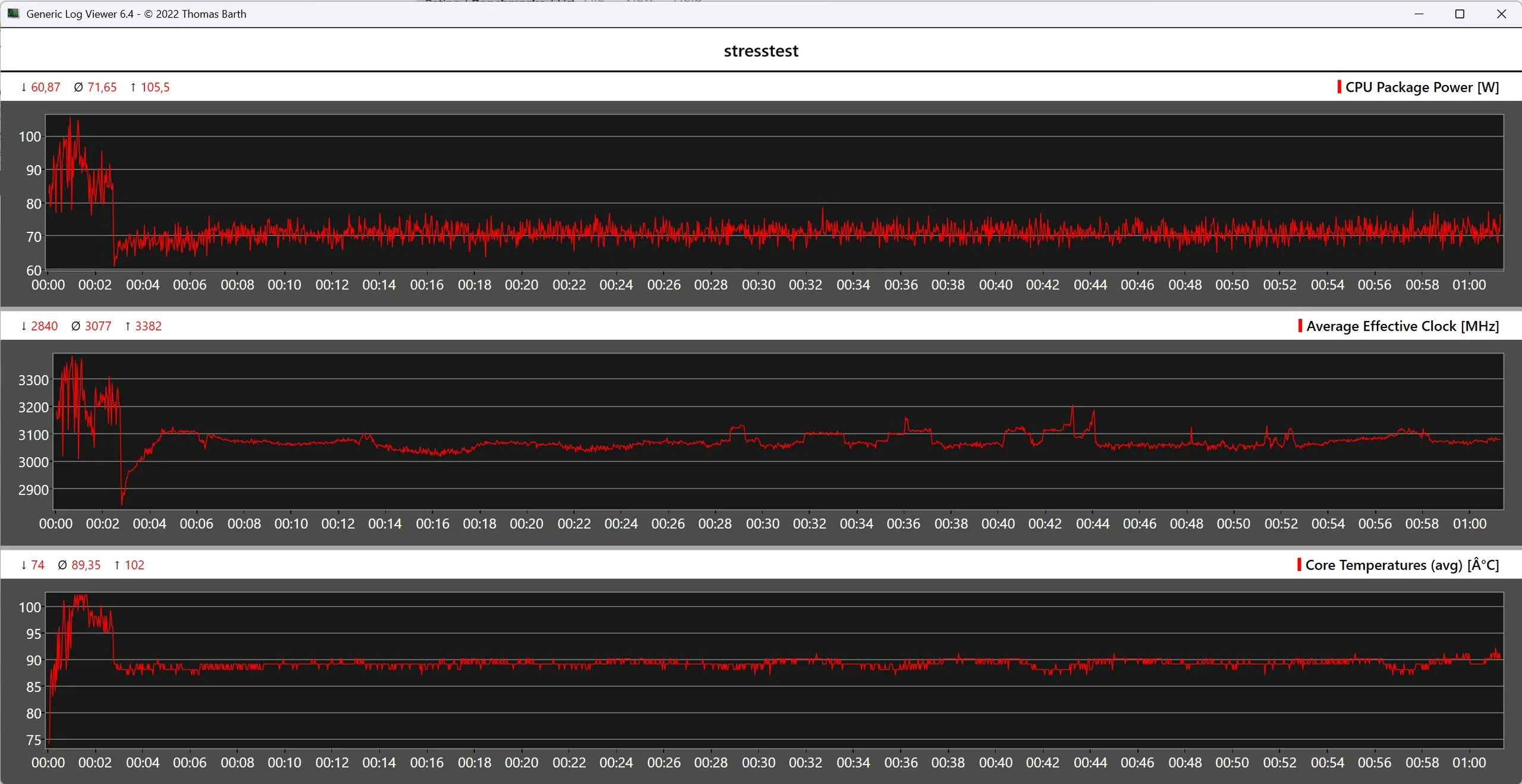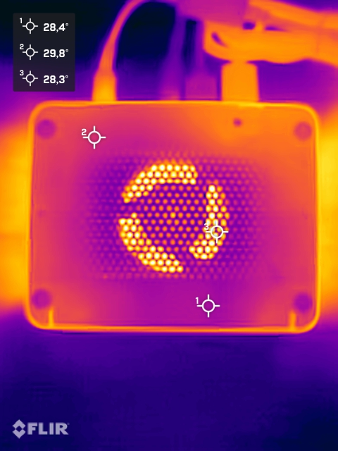 As temperaturas da superfície do Asus NUC 15 Pro+ aumentam significativamente sob carga, mas não atingem nenhum ponto crítico de aquecimento graças à superfície de plástico. O Intel Core Ultra 9 285H atinge temperaturas de cerca de 100 °C no teste de estresse. É possível um consumo de energia de curto prazo de mais de 100 watts, enquanto a carga contínua fica em torno de 71 watts. Essas temperaturas estão dentro das especificações, pois o processador foi projetado para até 110 °C.